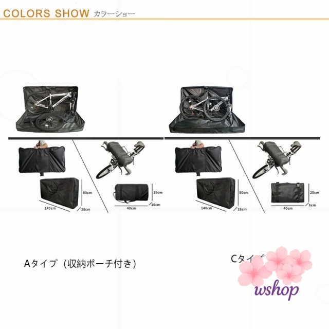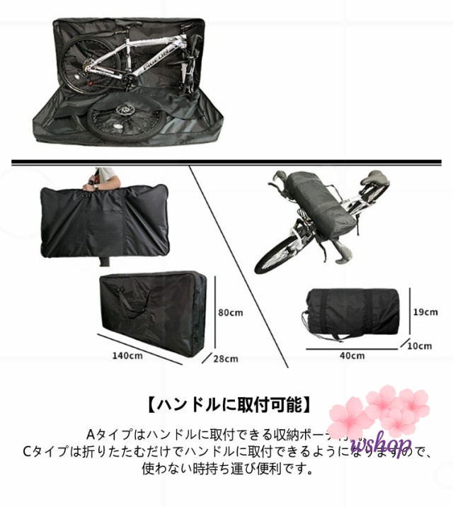 | 26~27インチ対応♪コンパクトに収納、手軽に持ち運ぶ輪行バッグ。 【収納簡単・フレームを傷つけにくい】ホイールポケット(仕切り)付きでわざわざホイールを縛る手間なく、自転車を横向きに収納することができます。ホイールと自転車フレームを別々に収納することができ、傷つけることを避けられます 【前輪外しタイプで楽チン】前輪を外す横型の輪行バッグで、26インチ?27インチ?700cの自転車(ロードバイク/クロスバイク/マウンテンバイク)に対応します。初心者でも簡単に収納できる輪行キャリングバッグ、自転車保管、移動、引っ越し等にオススメです。 【修理ツールも収納可能】外側にポケットがあり、自転車のアクセサリーや修理ツール等の収納用に活用できます。 【ハンドルに取付可能】Aタイプはハンドルに取付できる収納ポーチ付属、Cタイプは折りたたむだけでハンドルに取付できるようになりますので、使わない時持ち運び便利です。 【丈夫な素材】耐久性のある防水素材、高い引裂抵抗、耐摩耗性に優れ、長くお使いいただけます。 【自転車移動に便利】ロードバイクやクロスバイクの持ち運びに最適な、輪行バック。自転車を収納して、電車などの公共交通機関に乗車できる輪行袋です。 | |