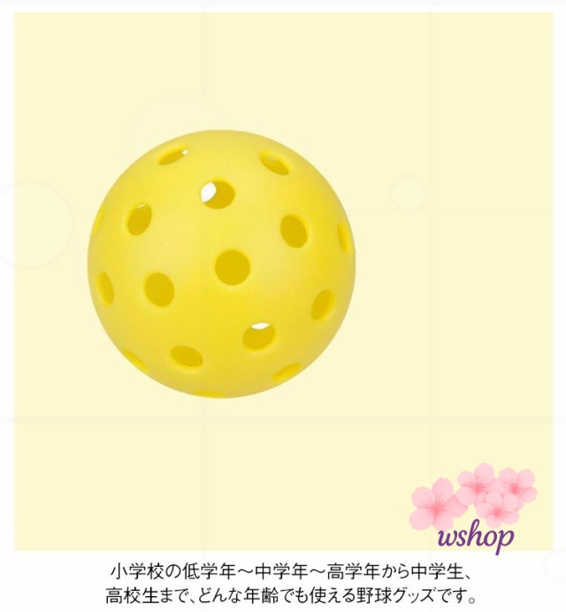 | 室内でも練習できる!軽くて柔らかいバッティングボール 弾力性があり柔らかいのでケガの心配が少なく、お子様と安全に打撃練習できます。 軽くて壊れにくいので、毎日バッティング練習するお子様にピッタリ!バットで打っても、足で踏みつけても割れにくい◎ 穴あき形状で飛びすぎない!狭い室内で練習するのにも最適です。 自宅、家、体育館、公園、広場、庭などあらゆる場所で使えます。 練習だけでなく、試合前のウォーミングアップや、合宿・遠征先でも大活躍! 小学校の低学年?中学年?高学年から中学生、高校生まで、どんな年齢でも使える野球グッズです。 | |