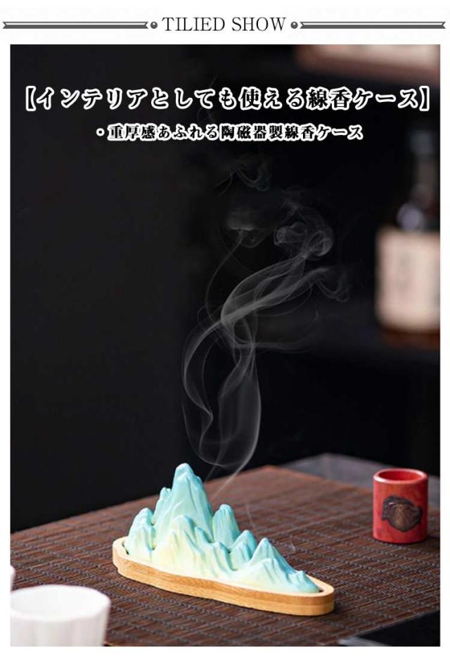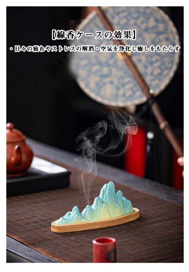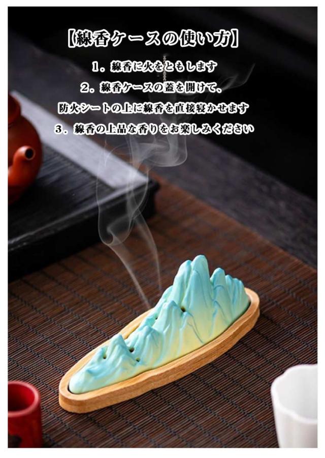 | 陶器製山型線香ケース。【木製トレー】 【インテリアとしても使える線香ケース】・重厚感あふれる陶磁器製線香ケース 【線香ケースの効果】・日々の疲れやストレスの解消・空気を浄化し癒しをもたらす 【防火シートについて】・火が燃え移らず安心・使用後も線香の香りが持続 【線香ケースの使用場所】・リビングやオフィス、客間など香りを楽しむ所・書斎や仏間など静寂を求める所 【線香ケースの使い方】1.線香に火をともします2.線香ケースの蓋を開けて、防火シートの上に線香を直接寝かせます3.線香の上品な香りをお楽しみください | |