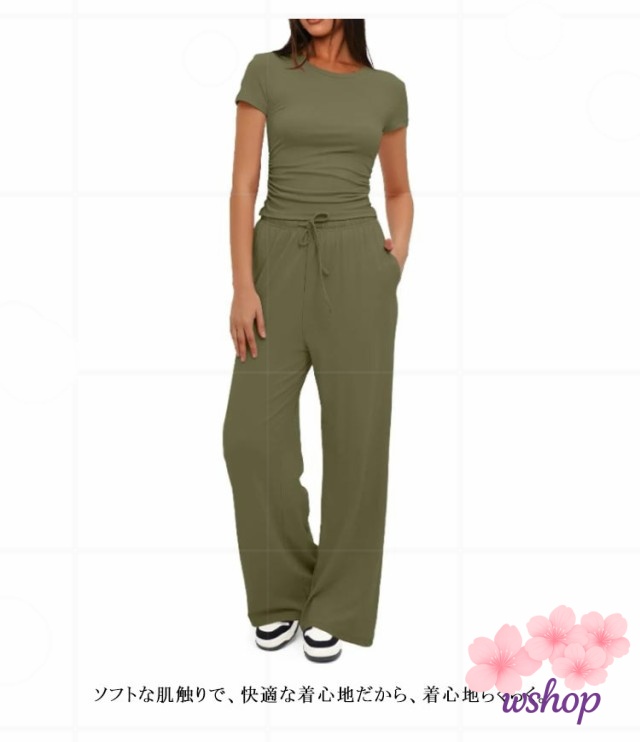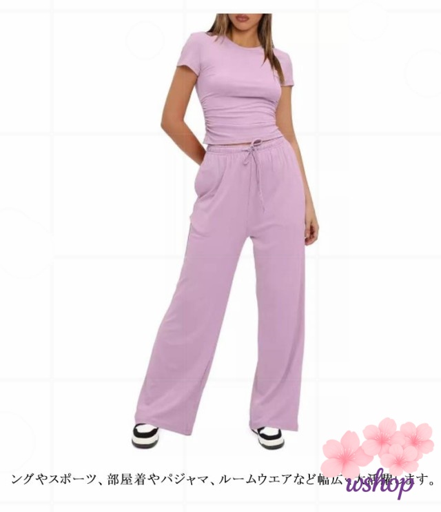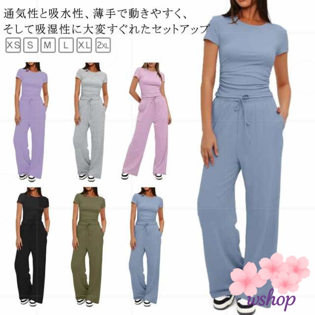 【wshop】ヨガ アウトドア ゆったり クルーネック きれいめ 送料無料 ジョギング 夏 半袖 レディース ロングパンツ ジャージ パンツスーツ カジュアル 部屋着 tシャツ 体型カバー セットアップ 運動着 ダンス Tシャ ワイドパンツ スウェット おしゃれ ルームウェア 上下セッ