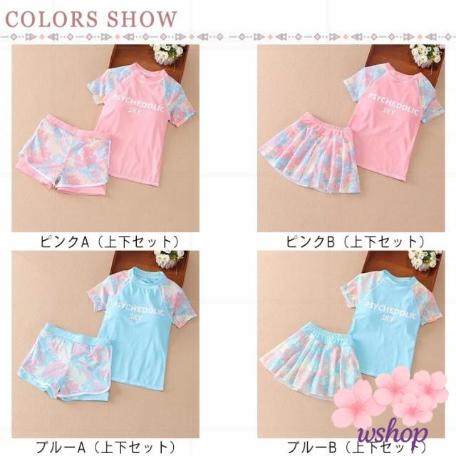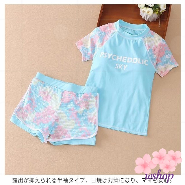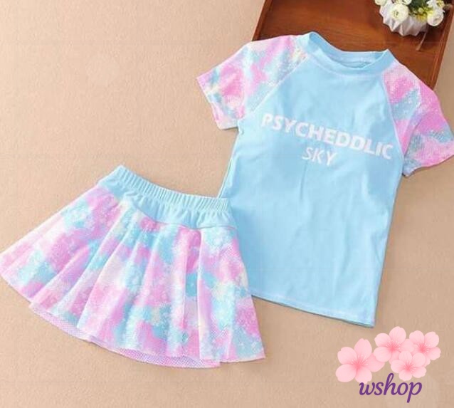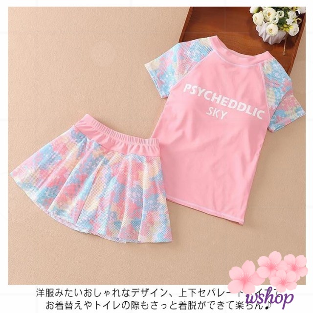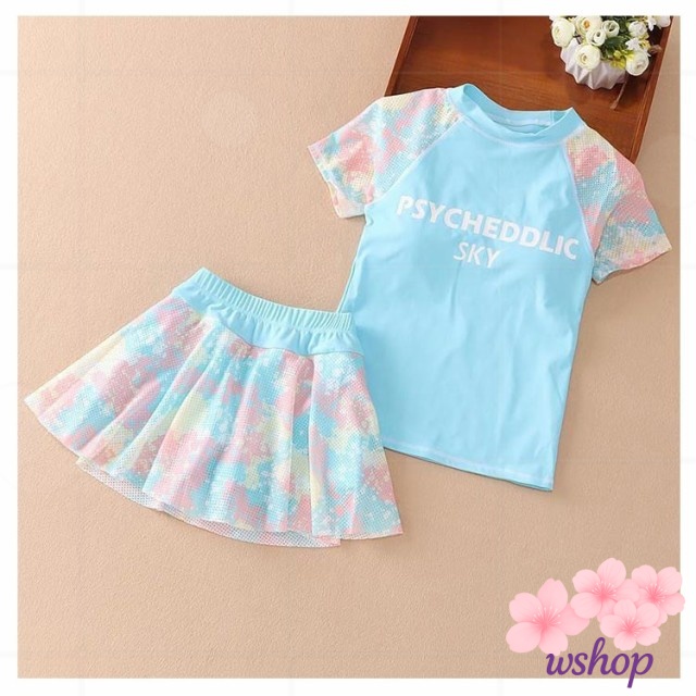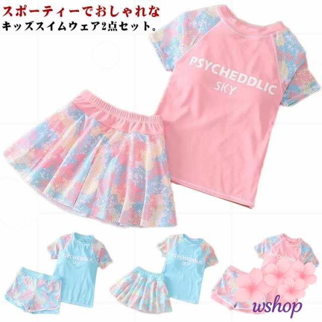 【wshop】海 2点セット 水陸両用 水着 インナーパンツ付き フィットネス水着 100-150cm キッズ水着 ラッシュガード セパレート ショーツ ガールズ ビーチ ジュニア水着 上下セット 子供水着 スクール水着 2点セット スカート 小学生 水着