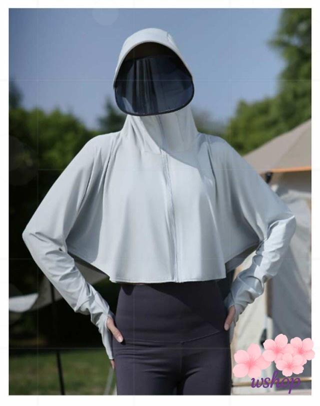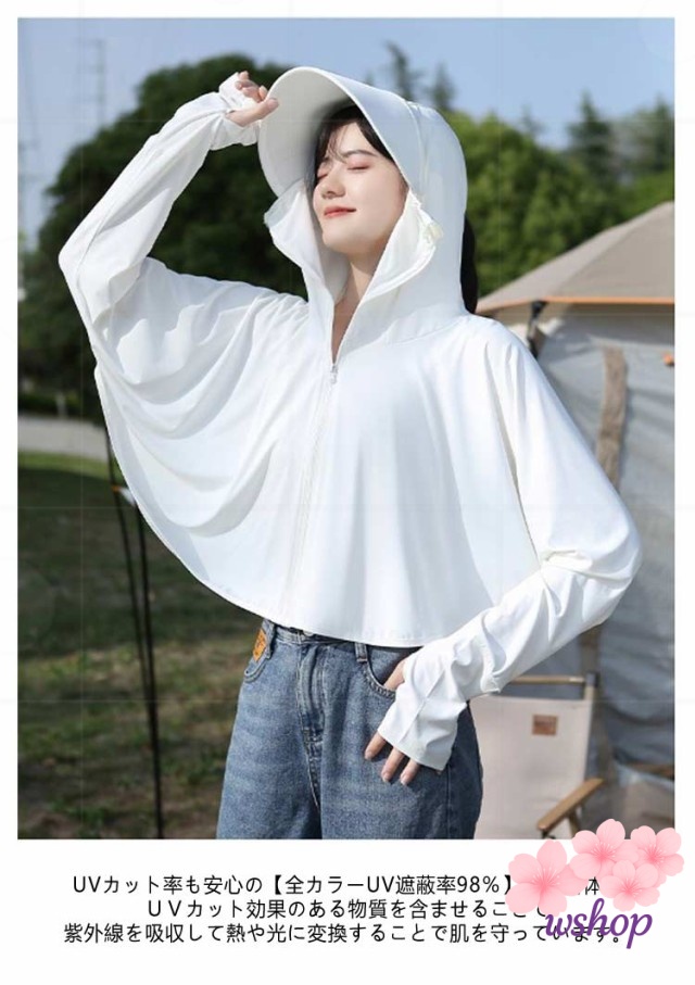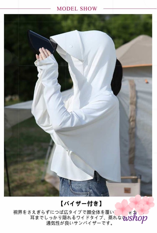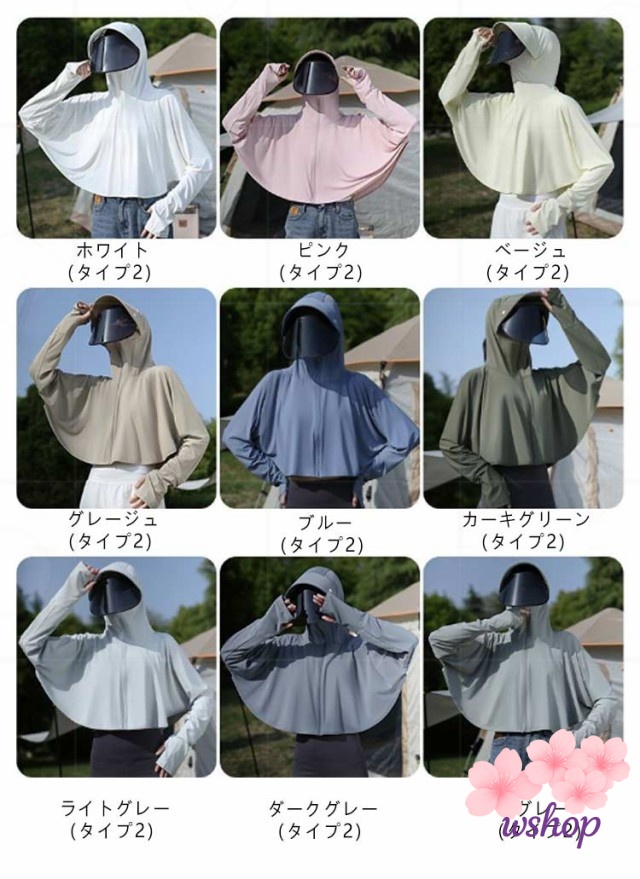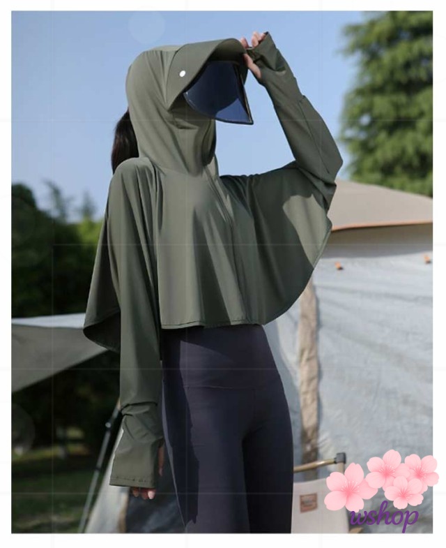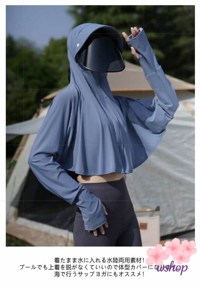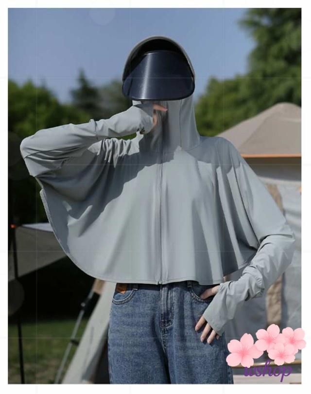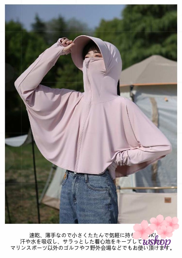 【wshop】ショート丈 ポンチョ 360度紫外線対策 マスク ラッシュガード 体型カバー バイザー トップス レディース フード付き 薄手 指穴 日焼け防止服 UVケア サンバイザー UV 吸汗 パーカー UVカット 長袖 熱中症対策 冷感 アウター UPF50+ ショート 取り外し可能 つば 速乾