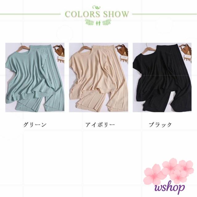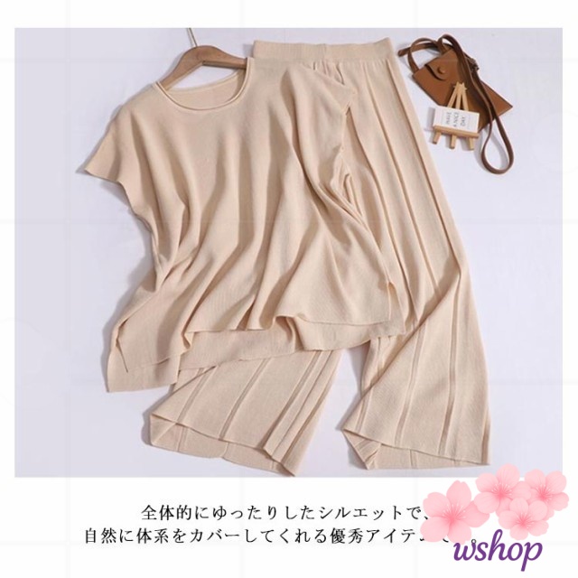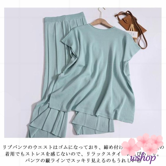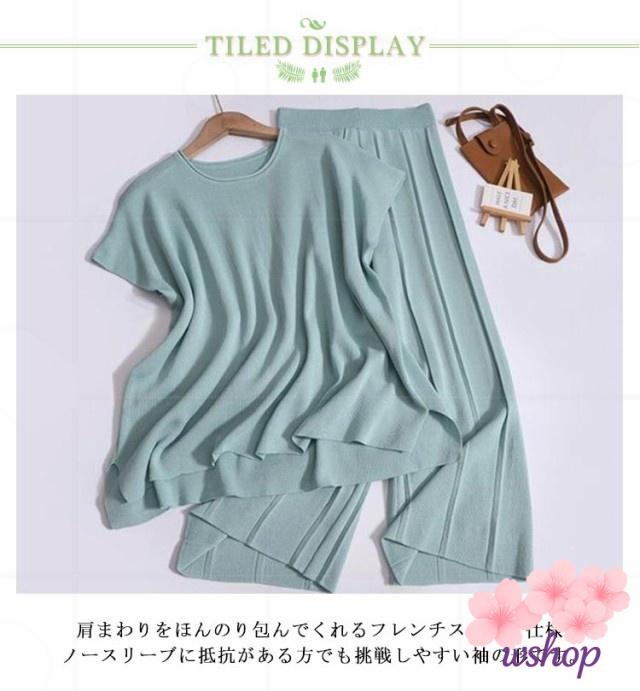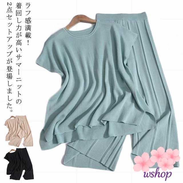 新登場 売上急増中 【wshop】30代 Tシャツ 上下セット 体型カバー サマーニット 着痩せ フレンチスリーブ ニットセットアップ ドルマン ゆったり 通勤OL カットソー レディース 半袖 20代 パンツスーツ 2点セット リブパンツ ワイドパンツ 在庫わずか