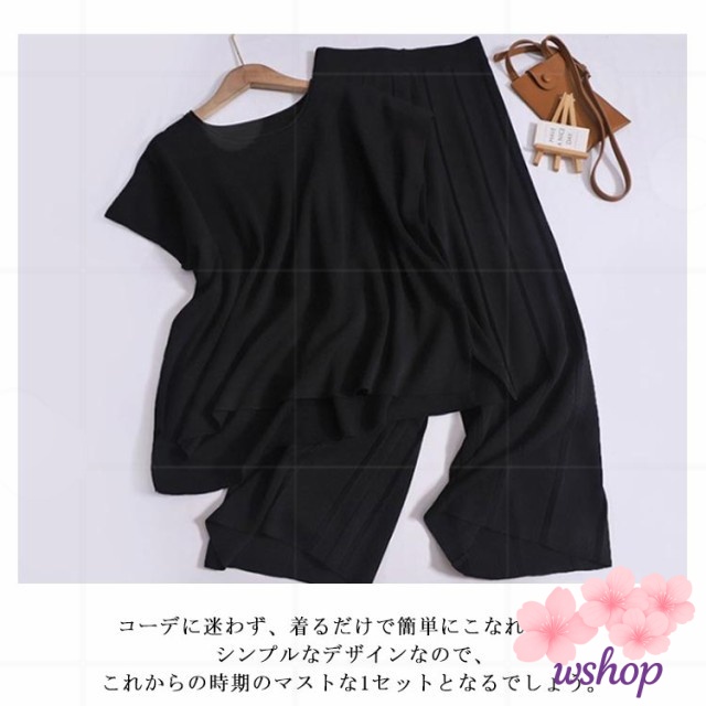 【wshop】30代 ワイドパンツ カットソー パンツスーツ ゆったり 2点セット レディース ドルマン 通勤OL サマーニット ニットセットアップ 着痩せ 体型カバー 20代 フレンチスリーブ ニットセットアップ パンツスーツ 上下セット 半袖 Tシャツ リブパンツ