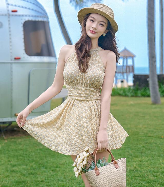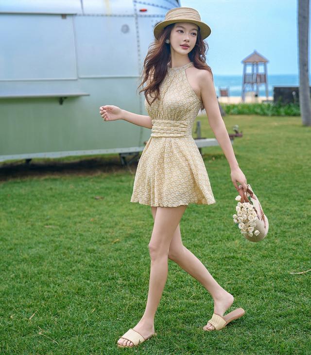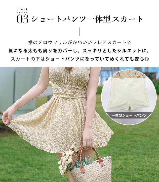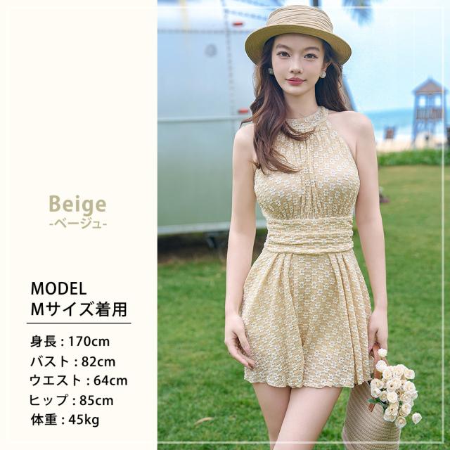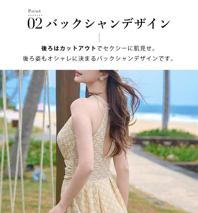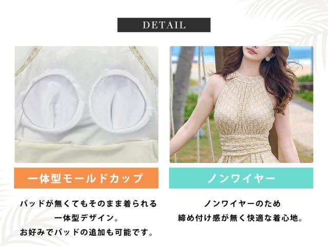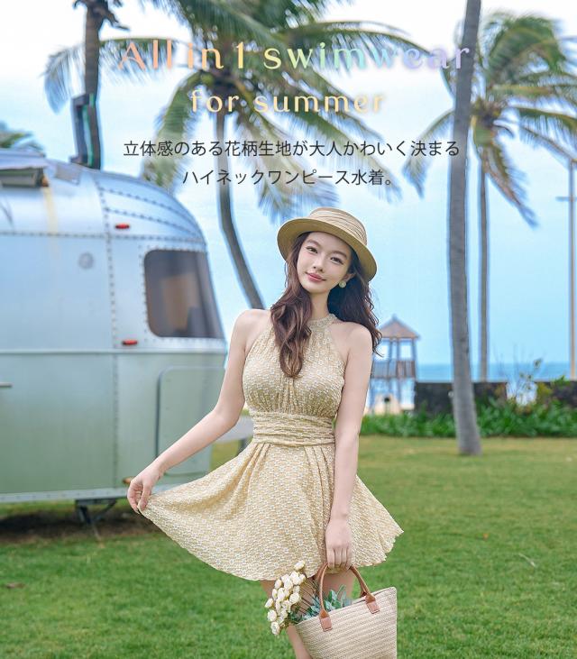 水着 ワンピース 体型カバー レディース オールインワン ハイネック 花柄 ノースリーブ ホルターネック バック カットアウト フレア ドレープ メロウフリル バックシャン きれいめ ノンワイヤー ウエスト ヒップ 太もも カバーアップ 海