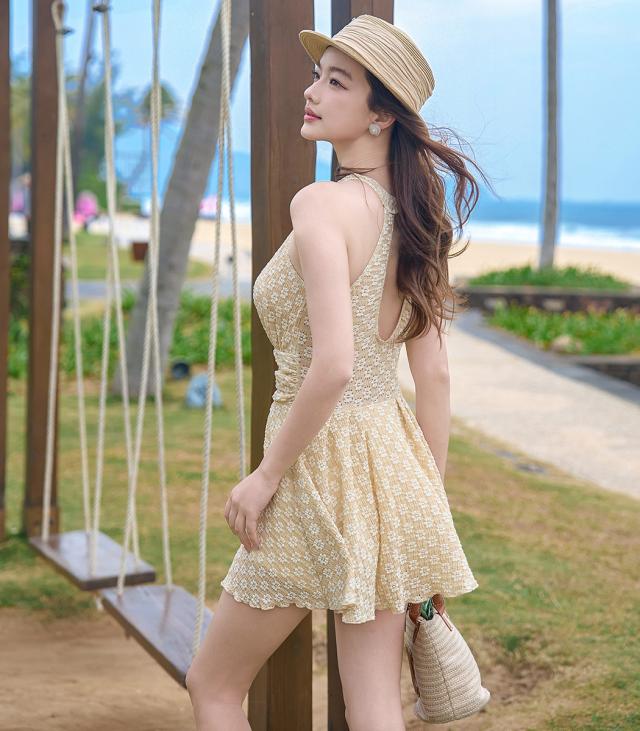 一体型のショートパンツと肌の透け感のコントラストがオシャレに決まります。