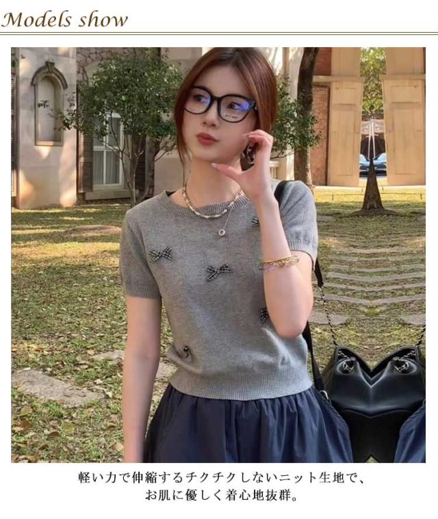 半袖Tシャツ リボン付き レディース 可愛い ニット グレー 夏 トップス おしゃれ サマーニット 春 半袖Tシャツ tシャツ クルーネック プルオーバー シンプル きれいめ ニットTシャツ カットソー 通学 通勤