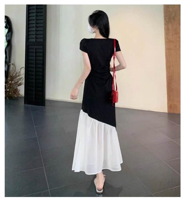 Uネック ワンピース 夏服 フレンチスリーブ 半袖 上品 きれいめ 切り替え 着?せ チュール ホワイト おしゃれ フリル パーティドレス レディース スリム ロングワンピース シンプル カジュアル 大人 フォーマル ブラック