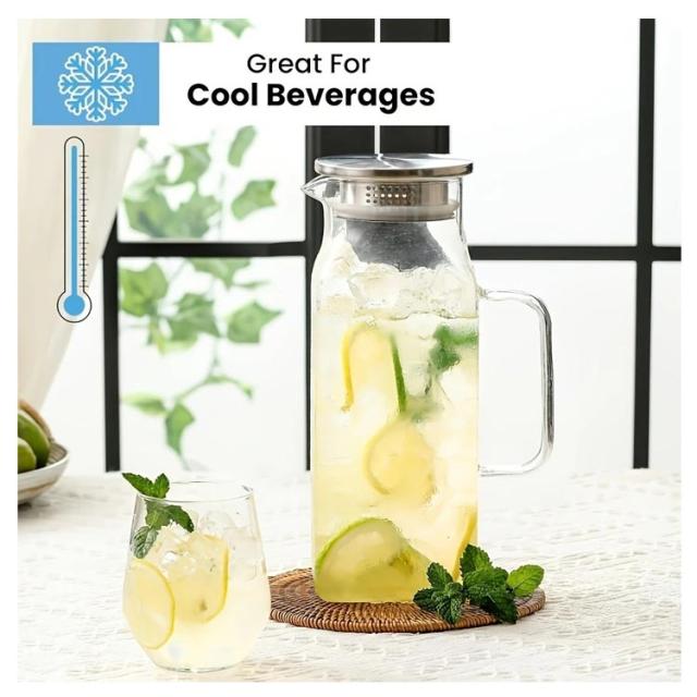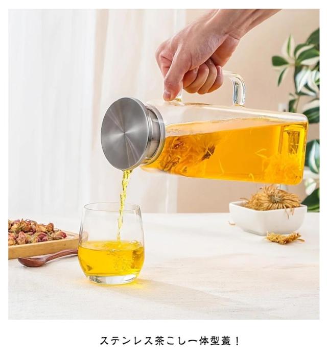 | ステンレス茶こし一体型蓋! ボトルの口径が大きく、手が直接差し込めて清潔できます 麦茶、紅茶、ジュース、コーヒー、ミルクなどの飲み物を淹れたい時にご気楽にお使えいただけます。 耐熱ガラスので、温かい飲み物にも冷たい飲み物にも使える耐熱ガラス製のピッチャーです。 | |