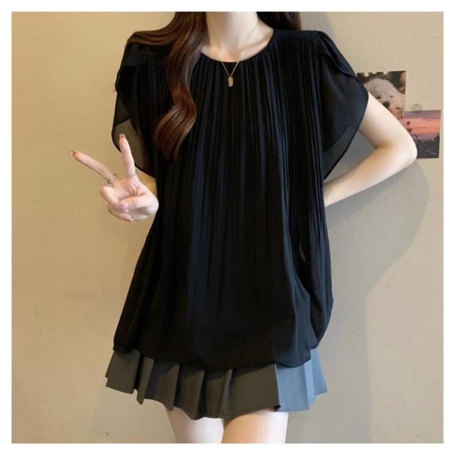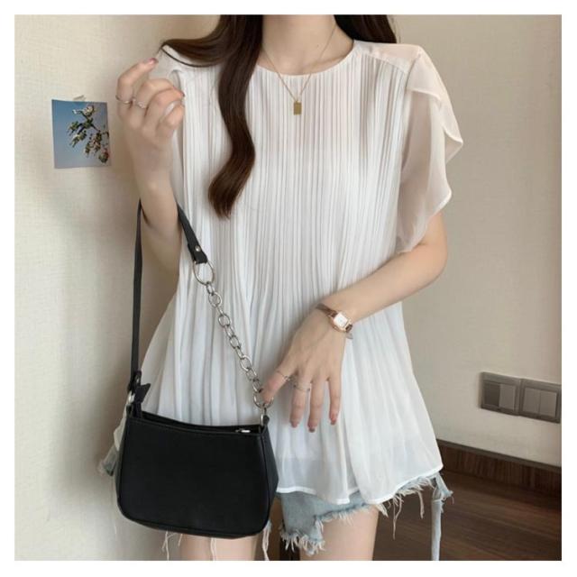 夏 Aライン プリーツ フレア袖 レディース トップス 半袖 ブラウス 薄手 フレアブラウス 体型カバー 半袖トップス シアーブラウス ゆったり フレンチスリーブ シフォン 透け感 おしゃれ ブラウス シンプル きれいめ 無地 フェミニン エレガント 夏物 白 黒