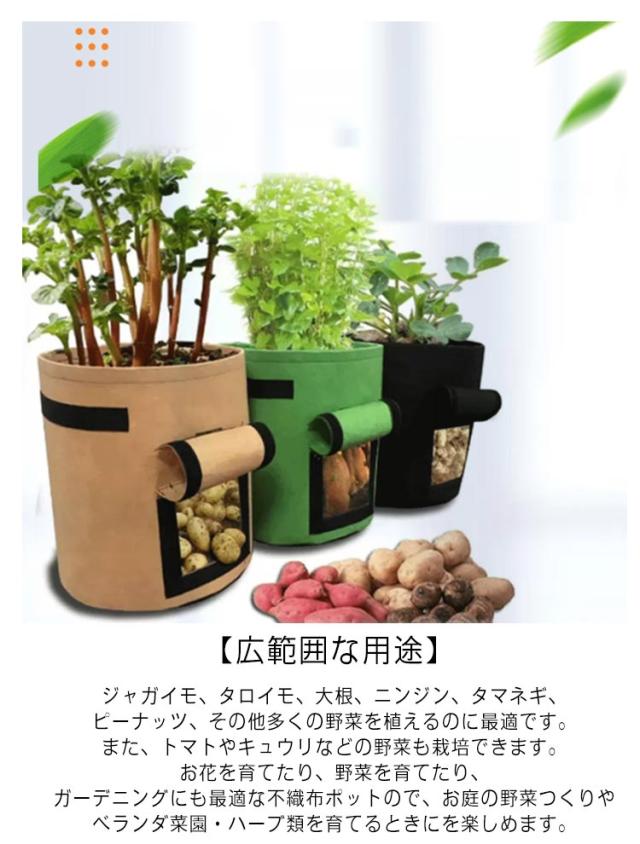 | 【高品質の材質】環境に優しい不織布。厚手の不織布と裏地から作られて、通気性、透水性、放熱性に優れているため植物の発育が良いと評価され、育苗、植栽用の鉢として広く使われています。高温時は熱で根が傷むこともありませんが、根の発育を促進し、根腐れが起こりにくいです。また丈夫さがよくて長持ちができ、何回を繰り返して利用できます。 【サイド開口設計】可視ウィンドウから簡単に収穫できます。これを使用して、野菜が熟しているかどうかを判断し、粘土土を掘ったり、苗を傷つけたりすることなく、直接収穫できます。 【室内栽培可能】軽量で持ち手が付いてるので移動が楽です。室内栽培可能,透水性と保水性がありますので底面に石を敷く必要なし。不織布が土の流出を防ぎ鉢底石いらずのポットなので、ベランダでの利用にも便利です。 【取っ手が付い】フェルトプランターは丈夫な取っ手が付いてあり、移動するときとても便利です。 【広範囲な用途】ジャガイモ、タロイモ、大根、ニンジン、タマネギ、ピーナッツ、その他多くの野菜を植えるのに最適です。また、トマトやキュウリなどの野菜も栽培できます。お花を育てたり、野菜を育てたり、ガーデニングにも最適な不織布ポットので、お庭の野菜つくりやベランダ菜園・ハーブ類を育てるときにを楽しめます。 | |