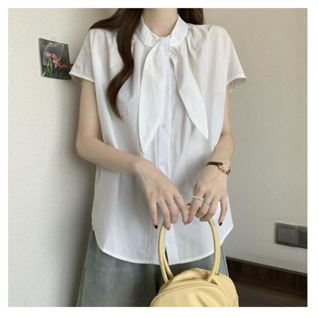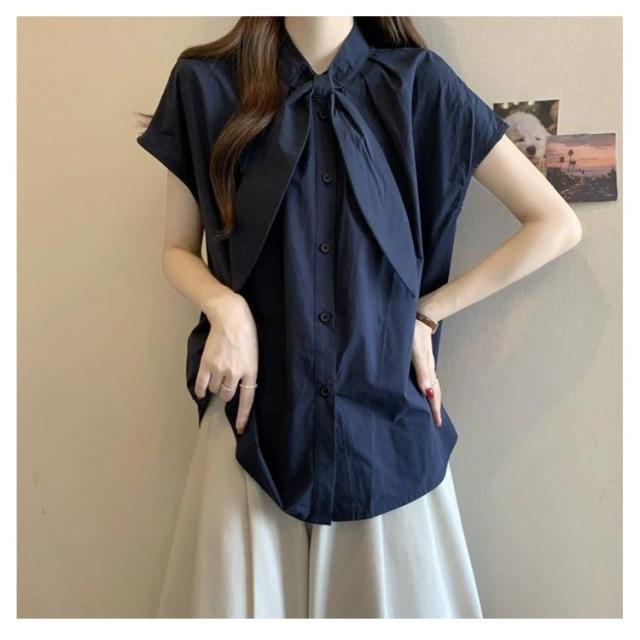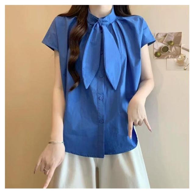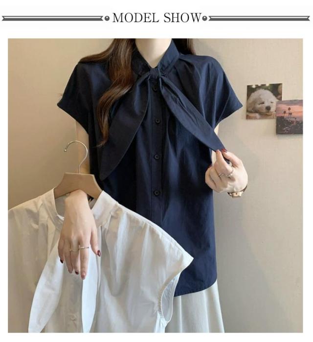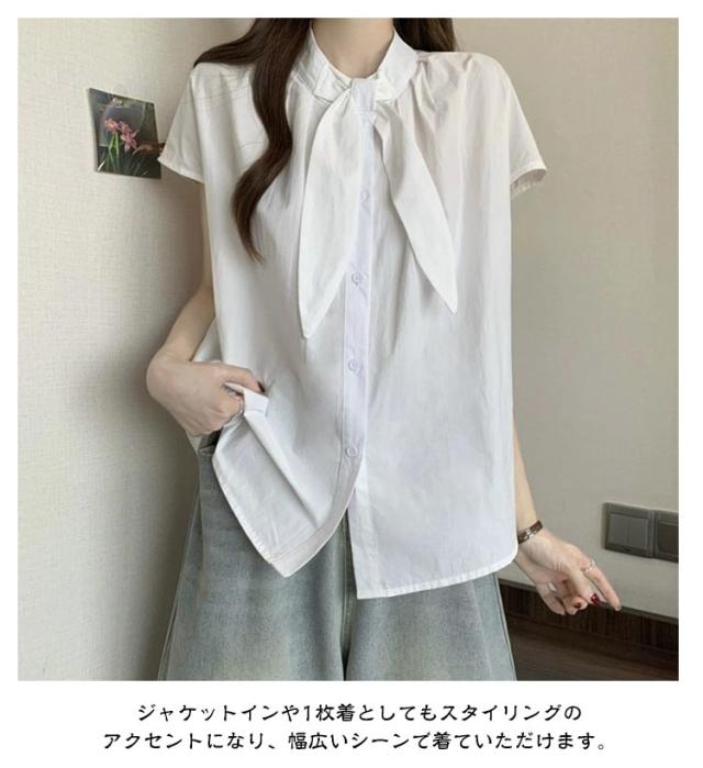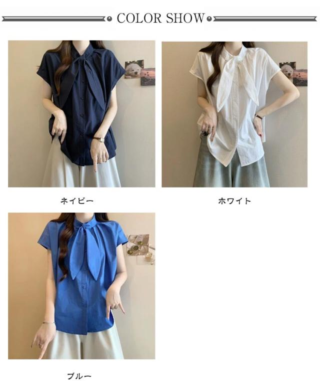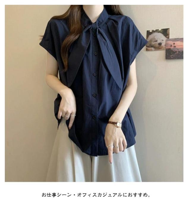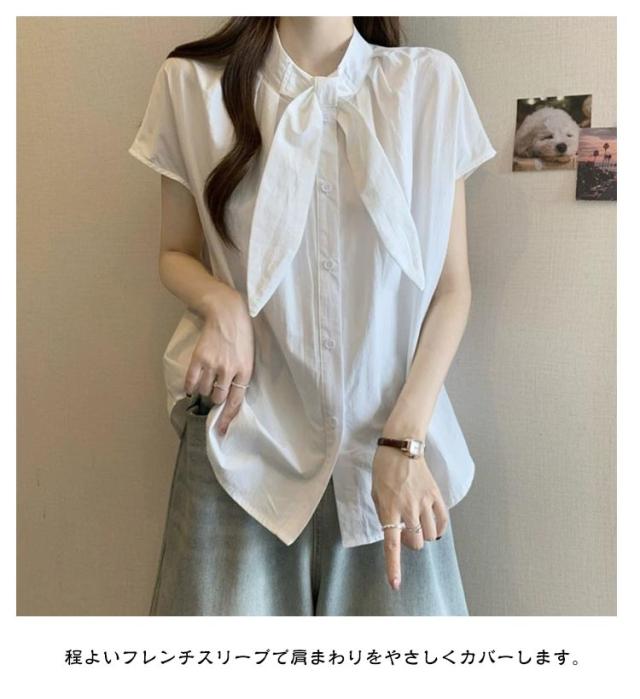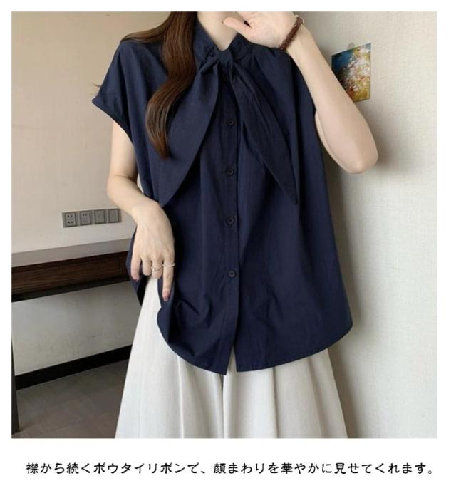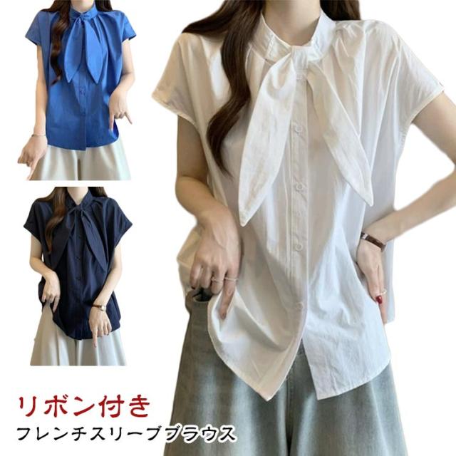 リボン トップス ブラウス フレンチスリーブ 半袖シャツ レディース フレンチスリーブシャツ ボウタイ 半袖 シャツブラウス スタンドカラー 体型カバー ゆったり 無地 半袖シャツ 大人可愛い シンプル ホワイト きれいめ おしゃれ 夏物 白 薄手 ネイビー 紺 大きいサイズ