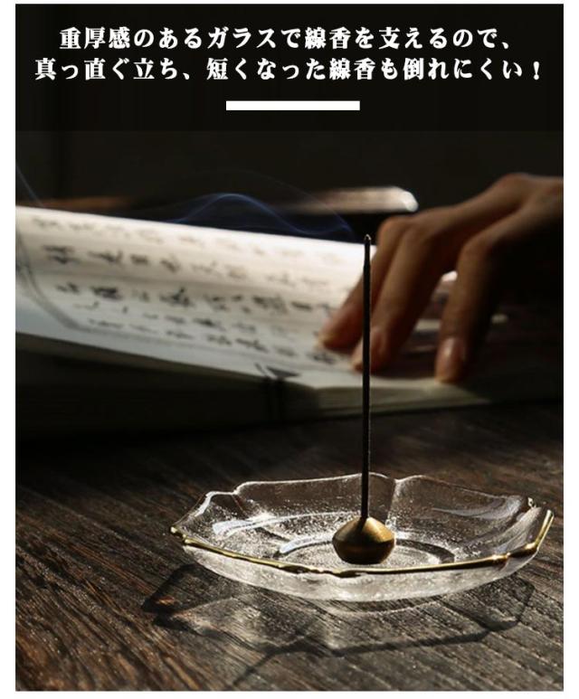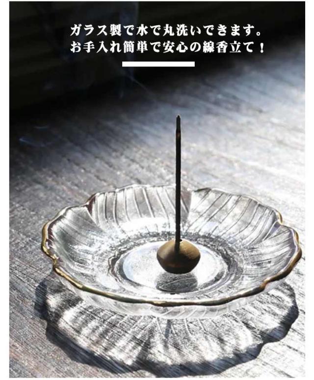 | 高級感のあるガラス製線香立て付線香皿。【灰いらず】 灰なしでお線香が立つ、灰いらずの線香立てです。 線香立ての灰は、倒れやすくキケン…燃えカスの処理が面倒…こぼれたり風で飛ぶ…といったトラブルがつきもの。 重厚感のあるガラスで線香を支えるので、真っ直ぐ立ち、短くなった線香も倒れにくい! ガラス製で水で丸洗いできます。お手入れ簡単で安心の線香立て! | |