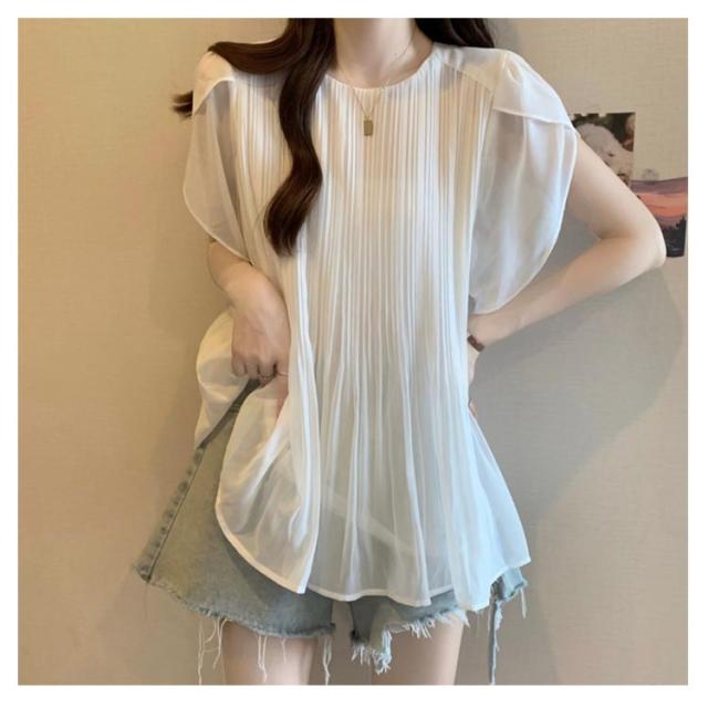 ブラウス プリーツ フレアブラウス 半袖ブラウス 薄手 ゆったり フレンチスリーブ 夏 シアーブラウス 半袖 体型カバー トップス レディース 半袖トップス Aライン シフォン 透け感 フレア袖 無地 シンプル きれいめ おしゃれ フェミニン エレガント 夏物 白 黒