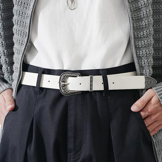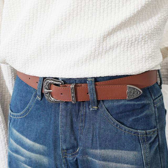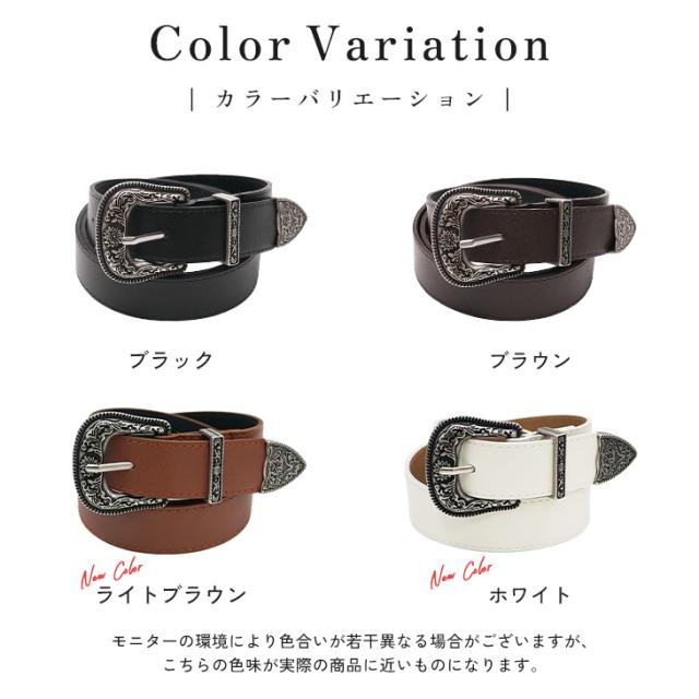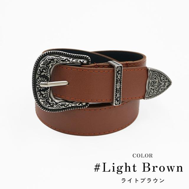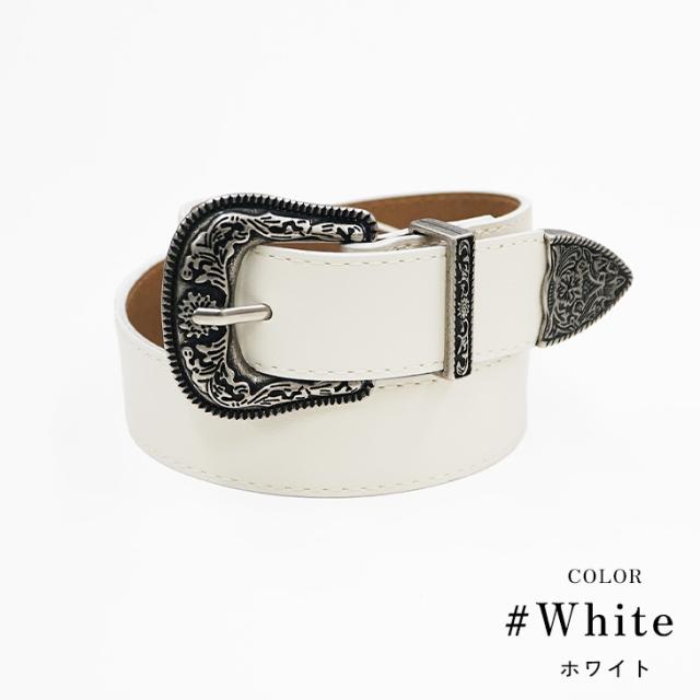 剣先やバックルに施されたアンティーク調のデザインが目を惹くレザーベルト。柔らかいPUレザーを使用しており、滑らかなツヤ感のあるアイテムです。
