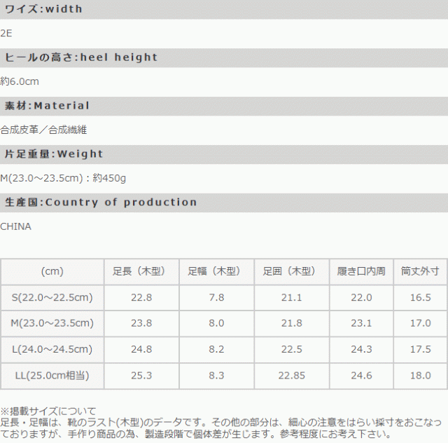 足長(木型):22.8cm/足幅(木型):7.8cm/筒周内周:22.0cm/筒丈外寸:16.5cm