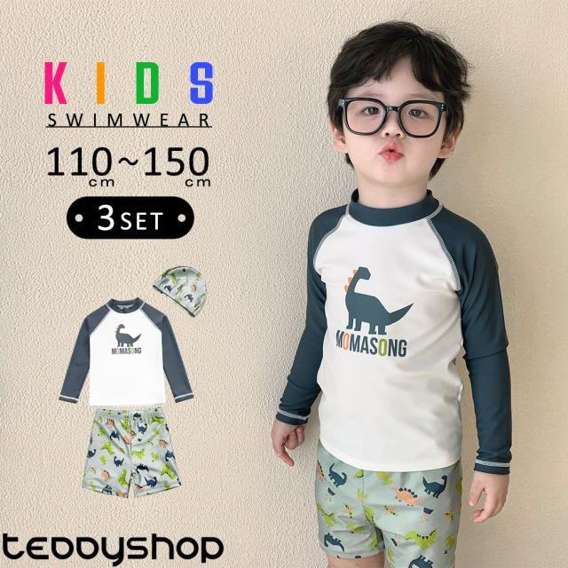 夏新作 キッズ 水着 男の子 セパレート ラッシュガード トップス 長袖 ハーフパンツ スイムキャップ 3点セット 110 120 130 140 150 ロゴ 恐竜 ラグランスリーブ ウエストゴム 上下セット 紫外線対策 裏地付き 幼稚園 保育園 小学生 低学年 中学年