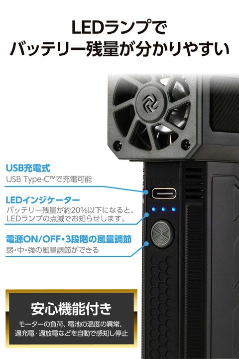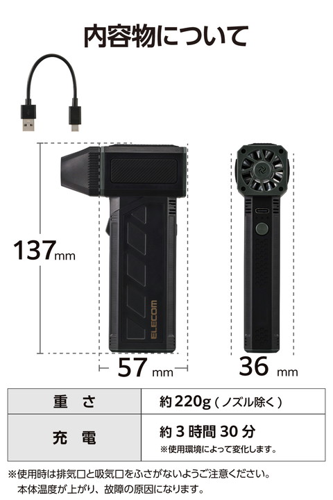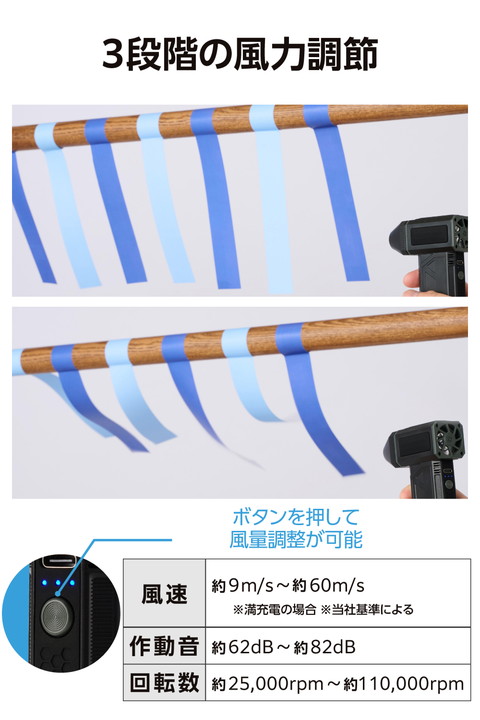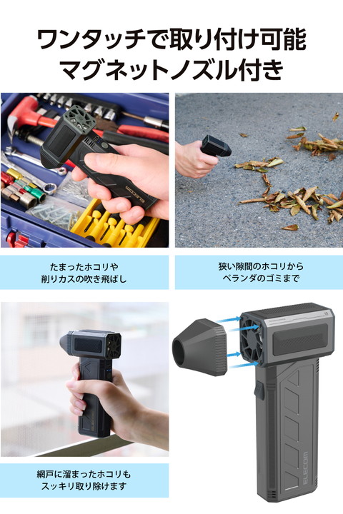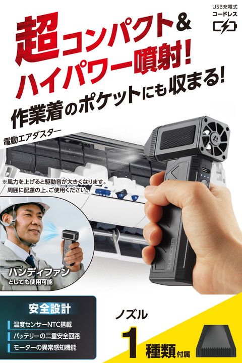 超コンパクトサイズながらハイパワー風力!玄関まわりのゴミや洗車後の水滴まで手軽に掃除できる、電動エアダスターです。モーターに負担がかかるなどの異常を感知すると、自動で停止する安心機能付き。ノズルを外して、ハンディファンとしても使えます。![]() ■ハイパワー噴射で玄関まわりのゴミやホコリ、洗車後の細部に残った水滴などを一気に吹き飛ばし、手軽に掃除できます。 ■作業着などの大きめのポケットに収まるほどの、超コンパクト設計で、どこでも気軽に使えます。 ■モーターの負荷、電池の温度の異常、過充電・過放電などを自動で感知し停止する安心機能付き。大切なバッテリーをしっかり守り、長く使えます。 ■簡単に取り付けられる、マグネットノズルが付属しています。 ■ノズルを外して、ハンディファンとしても使えます。 ■※風力を上げると駆動音が大きくなります。周囲に配慮のうえ、使用ください。 ■狭い隙間のホコリからベランダのゴミまで、家の中はもちろん車内や屋外でも幅広く活躍します。 ■工具箱にたまったホコリや削りカスを吹き飛ばして、手軽に掃除できます。 ■エアコン・掃除機などのフィルターや、網戸に溜まったホコリもスッキリ取り除けます。 ■小石や砂などが溜まりやすい窓のサッシ掃除にも便利です。 ■傘についた水滴をしっかり吹き飛ばせるので、カビや臭いの発生も予防できます。 ■パソコンの画面やキーボードの隙間、パソコン内部の繊細な箇所の掃除に活躍します。 ■逆さ噴射もできるので、さまざまな角度で使用可能です。 ■使用場所に合わせて風力を3段階に調節できます。 ■握ったまま電源のON/OFFができ、片手で簡単に操作可能です。 ■バッテリー残量が約20%以下になると、LEDランプの点滅でお知らせします。 ■コードレスで使えるUSB充電式。充電して繰り返し使用できます。 ■USB-A - USB Type-C(TM)ケーブルが付属しています。 ■※使用時は排気口と吸気口をふさがないようご注意ください。本体温度が上がり、故障の原因になります。 ■※排気口や本体内部に水が入ると故障の原因となります。濡れた場所で使用する際は、水がかからないよう十分ご注意ください。 ■※USB Type-C and USB-C are trademarks of USB Implementers Forum. ![]() ■外形寸法:W約57mm×D約36mm×H約137mm(ノズル除く) ■材質:ABS樹脂 ■カラー:ブラック ■重量:約220g(ノズル除く) ■バッテリー:リチウムイオン電池(2,500mAh×2本) ■風量調節:3段階 ■風速:約9m/s〜約60m/s ※満充電の場合 ※当社基準による ■作動音:約62dB〜約82dB ■回転数:約25,000rpm〜約110,000rpm ■連続作動時間:約10分〜約210分 ※風量によって変化します。 ■充電時間:約3時間30分 ※使用環境によって変化します。 ■保証期間:1年間 ■内容物:電動エアダスター本体、マグネット付き噴射ノズル、USB-A - USB Type-C(TM)ケーブル ■生産国:中国 |
