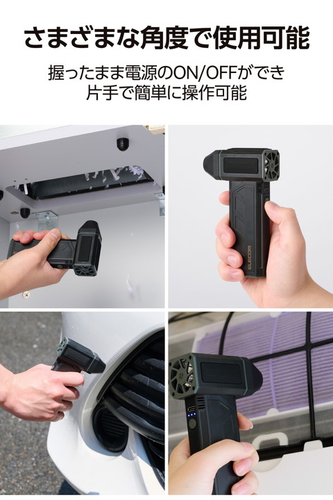 超コンパクトサイズながらハイパワー風力!玄関まわりのゴミや洗車後の水滴まで手軽に掃除できる、電動エアダスターです。モーターに負担がかかるなどの異常を感知すると、自動で停止する安心機能付き。ノズルを外して、ハンディファンとしても使えます。