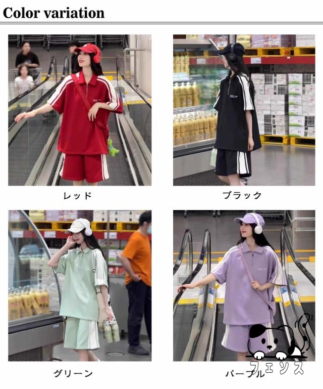 | 半袖・ハーフパンツ ジャージ上下セット ハーフアップ仕様のポロ風トップスとワイドショートパンツの上下セットアップです。 ビッグシルエットでゆったりルーズに着こなせます! 生地は吸汗速乾、さらっと快適。 サイドに白ラインの入った、シンプルでスポーティーなデザインです。 カジュアルコーデにはもちろん、スポーツやアウトドア、ルームウェア(部屋着)など様々シーンで活躍してくれる! | |