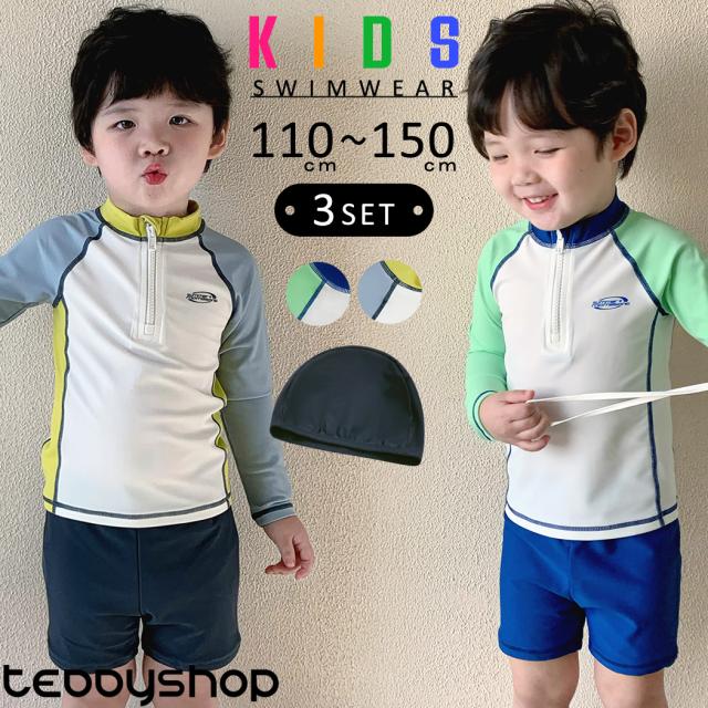 夏新作 キッズ 水着 男の子 セパレート ラッシュガード トップス 長袖 ハーフパンツ スイムキャップ 3点セット カラフル 110 120 130 140 150 ロゴ ラグランスリーブ プチハイネック ハーフジップ ウエストゴム 裏地付 幼稚園 保育園 小学生 低学年