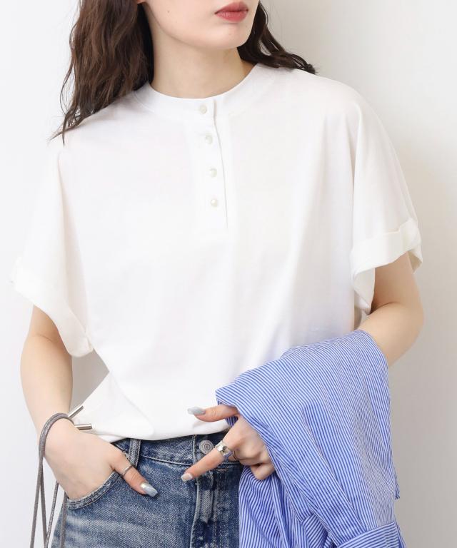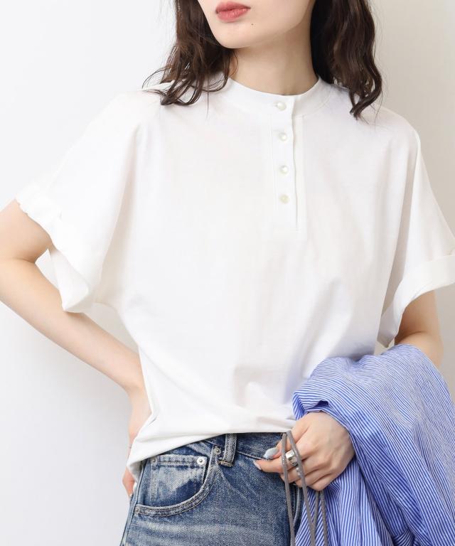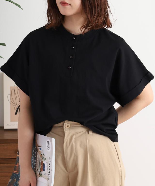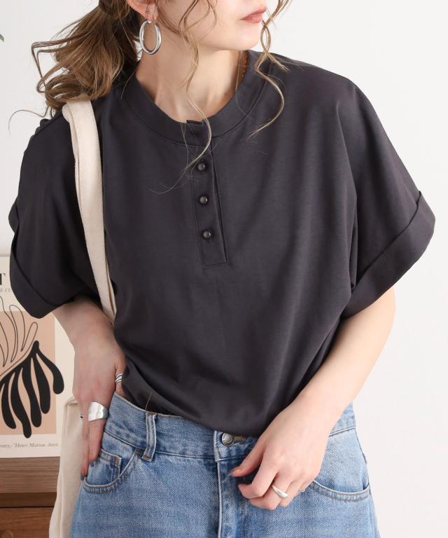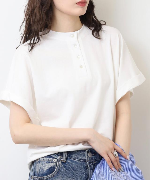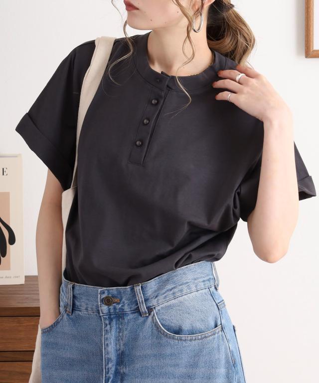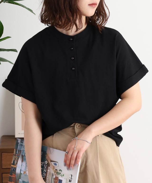 フロントにボタンを見せてヘンリーネック風に、バックにすればシンプルなクルーネックとしても楽しめるデザイン。