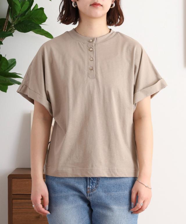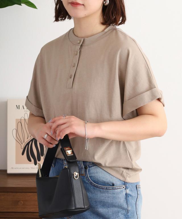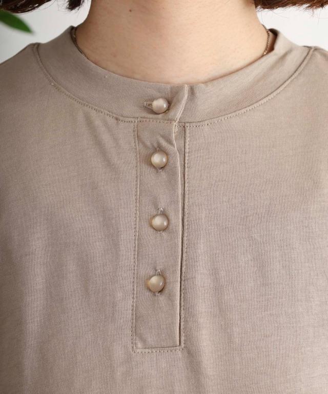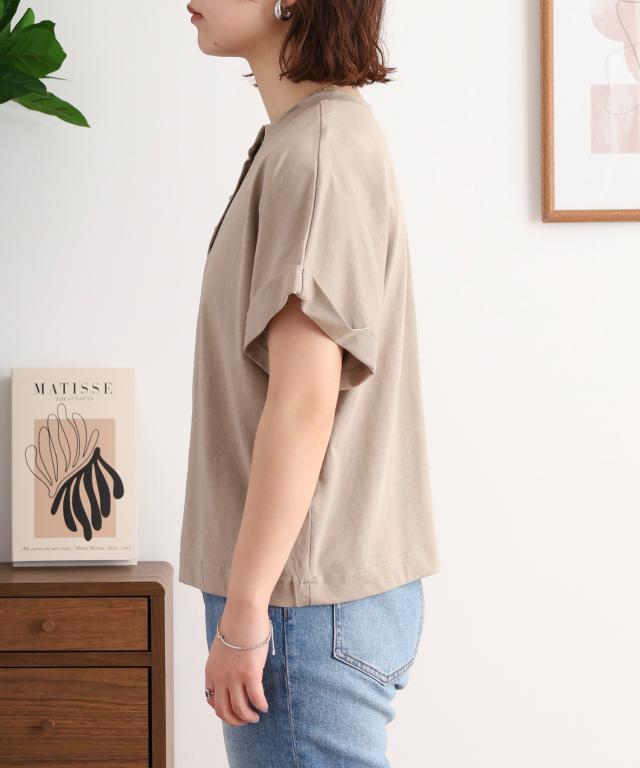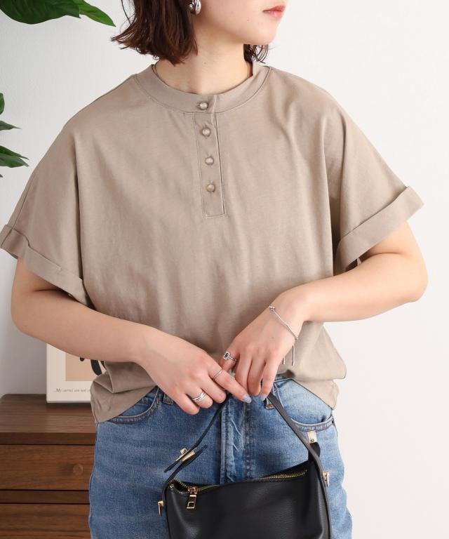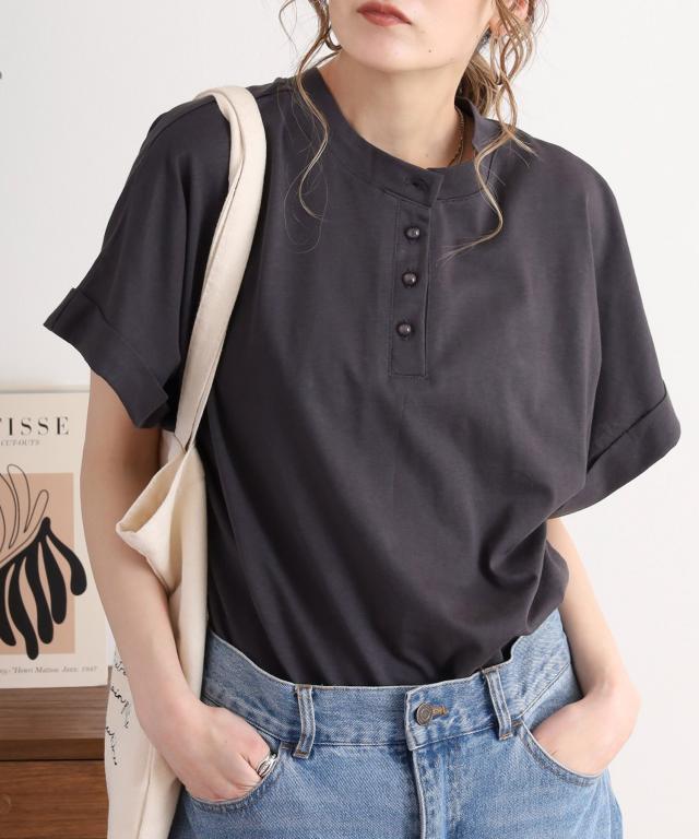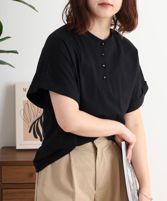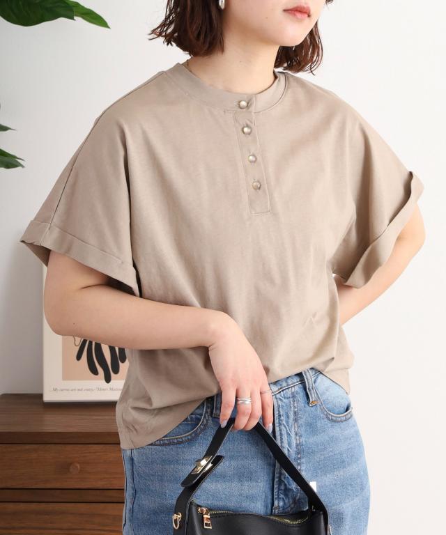 フロントにボタンを見せてヘンリーネック風に、バックにすればシンプルなクルーネックとしても楽しめるデザイン。