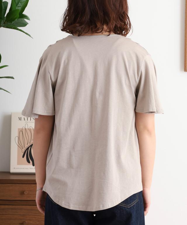 スキッパーネックと肩タックが程よい立体感を演出し、フェミニンなフレア袖が気になる腕まわりを優しくカバー。