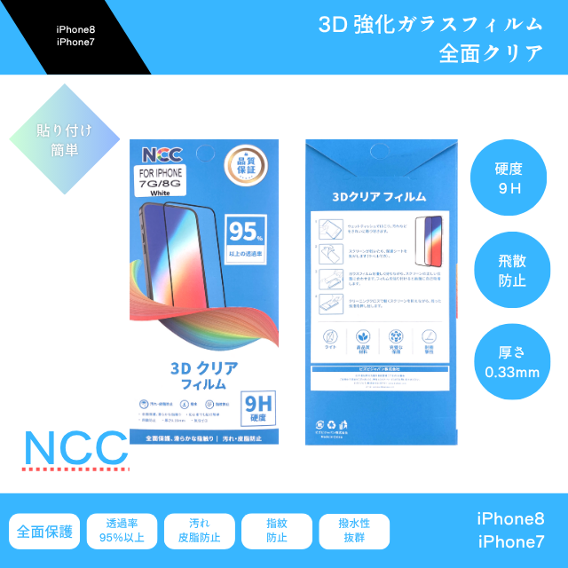 ガラスフィルム 3D全面クリア 保護フィルム NCC iPhone8用 iPhone7用 白 強化ガラス 硬度9H 飛散防止 自己吸着 全面保護 透過率 透明