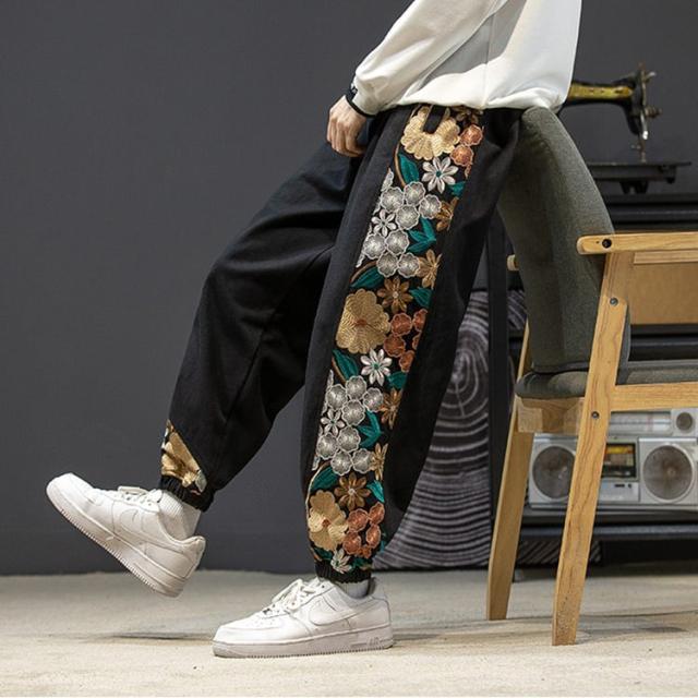 ジョガーパンツ メンズ 花柄 サルエルパンツ 刺繍 ワイドパンツ カジュアル ボトムス 切り替え オシャレ 個性的 pLegLad モード系 レディース 黒 体型カバー 20代 30代 40代 ブラック 春夏 秋