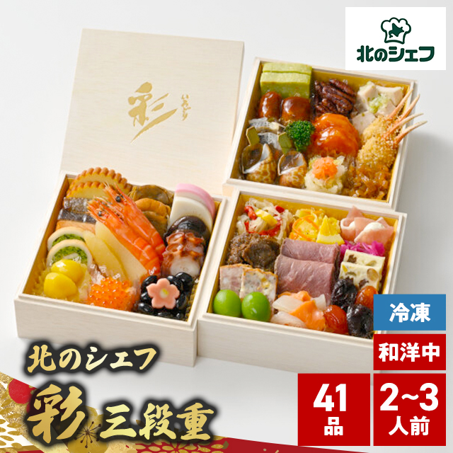 【ポイント増量中】 2026 おせち 北のシェフ 彩 和洋中 三段 2〜3人前 41品目 12月30日までにお届け / 冷凍 お節 御節 新年 和洋中 三段重 北海道 予約 予約販売 送料込み 数量限定 期間限定