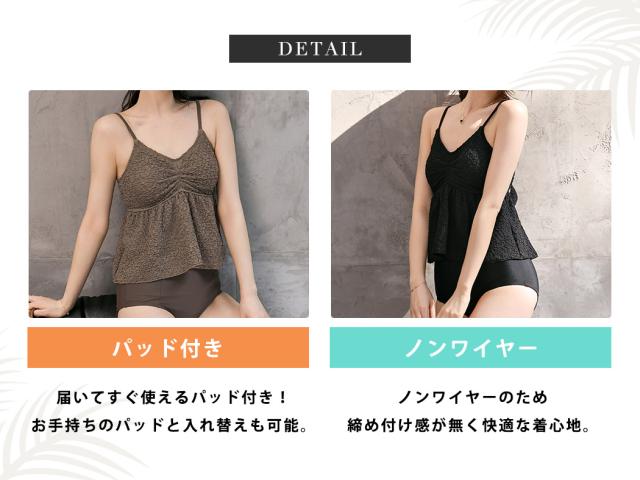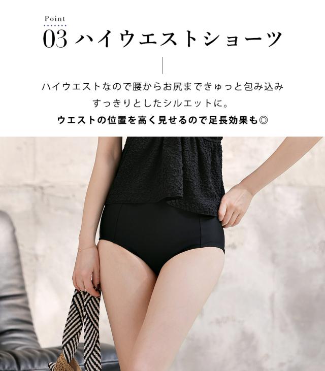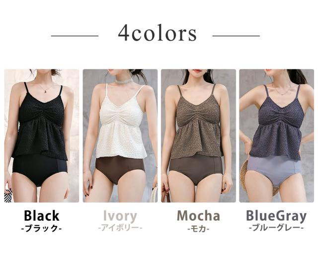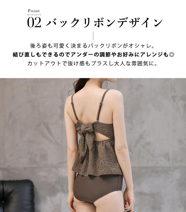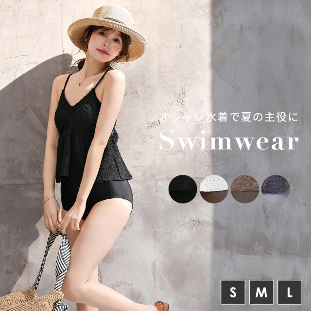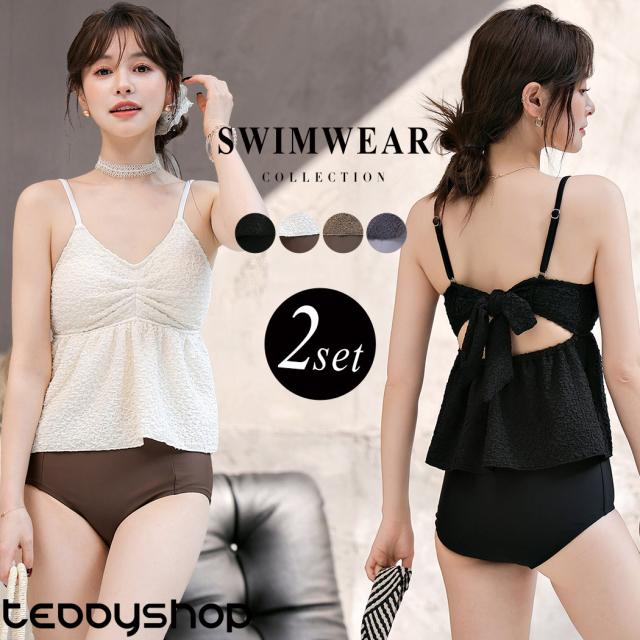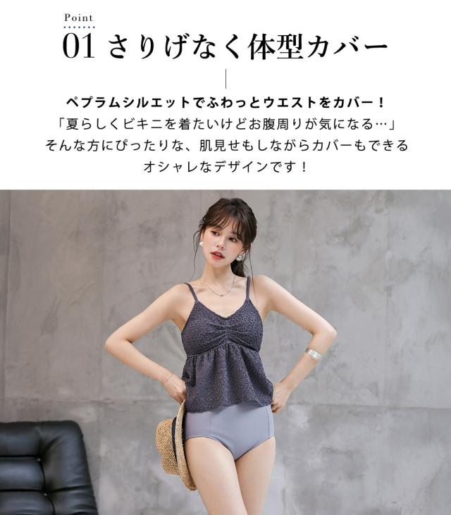夏新作 水着 ビスチェビキニ レディース 2点セット セパレート キャミキニ ノンワイヤー ペプラム ハイウエスト パッド付き バスト 盛れる バックリボン 肩紐 アジャスター アンダー ひも調節 ウエスト カバーアップ 脚長効果 黒