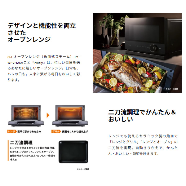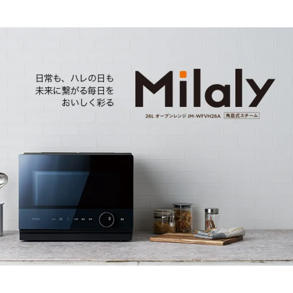 26Lオーブンレンジ(角皿式スチーム)JM-WFVH26Aこと『Milaly』は、忙しい毎日を送るあなたに嬉しいオーブンレンジ。日常も、ハレの日も。未来に繋がる毎日をおいしく彩ります。