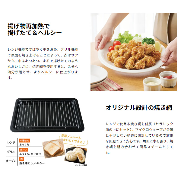 レンジ機能ですばやく中を温め、グリル機能で表面を焼き上げることによって、衣はサクサク、中はあつあつ、まるで揚げたてのようなおいしさに。焼き網を使用すると、余分な油分が落とせ、よりヘルシーに仕上がります。