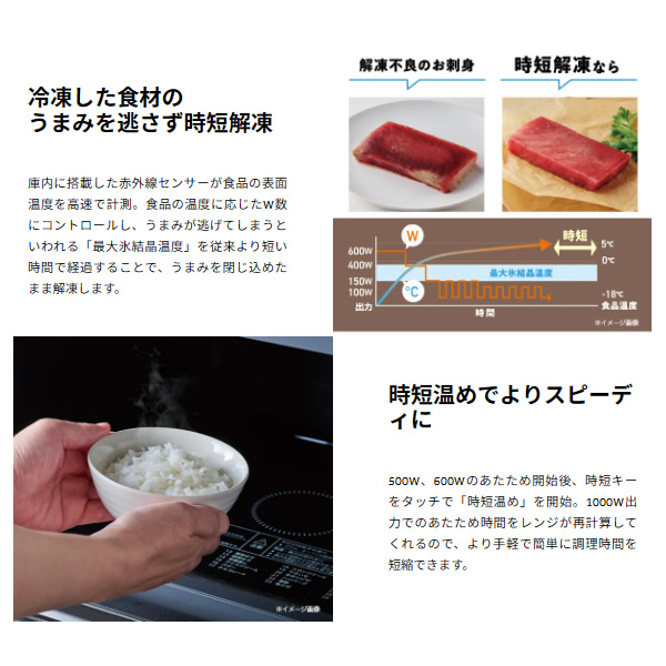 庫内に搭載した赤外線センサーが食品の表面温度を高速で計測。食品の温度に応じたW数にコントロールし、うまみが逃げてしまうといわれる「最大氷結晶温度」を従来より短い時間で経過することで、うまみを閉じ込めたまま解凍します。