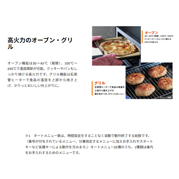 ※1 オートメニュー数は、時間設定をすることなく自動で動作終了する総数です。(番号が付与されているメニュー、分量指定するメニューに加えお手入れやスタートキーなど各種キーによる動作を含みます。)オートメニュー32種のうち、1種類は庫内をお手入れするためのメニューです。
