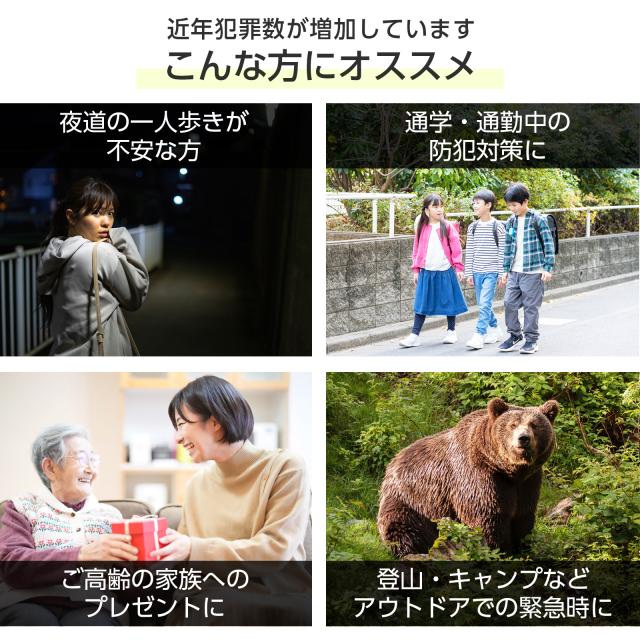 - 少年野球の試合会場でクマの目撃情報があったので買いました。クマが実際に出たら落ち着いて使えるか心配です。 今は鞄の中で眠っています。邪魔にならない程度の小ささです。