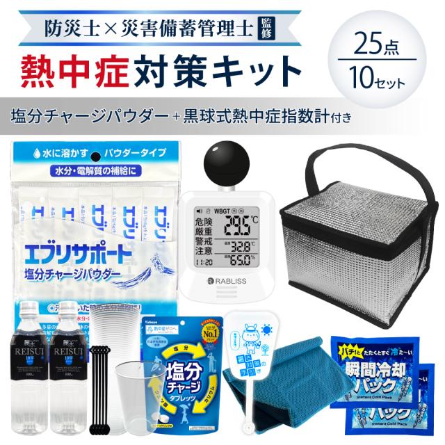 熱中症対策用品 熱中症対策キット シルバー 25点 10セット 黒球式熱中症指数計付き 塩分補給パウダー 熱中症対策グッズ WBGT 工事現場 農作業 ATK010K PEACEUP