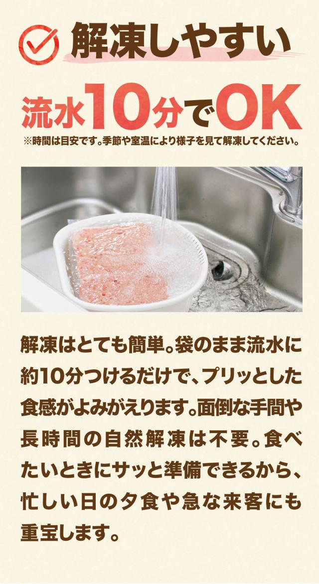 ・解凍後冷蔵庫で長時間放置すると変色する恐れがあります。
