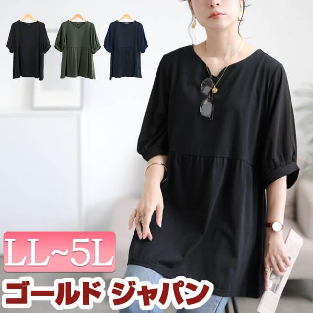 春新作 大きいサイズ レディース チュニック 袖シフォン切り替えペプラムチュニック ロング 5分袖 半袖 ペプラム ギャザー シフォン 切り替え 異素材 フレア ハートネック ストレッチ ゆったり 夏服 秋服 春服 LL 2L 3L 4L 5L ブラック 黒 カーキ ネイビー ゴールドジャパン