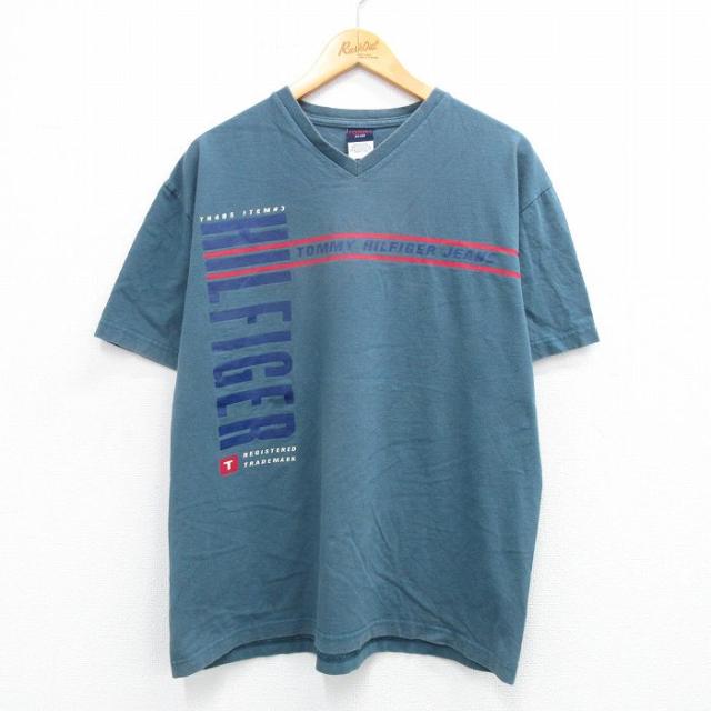 【商品名】 XL★古着 トミーヒルフィガー トミージーンズ 半袖 ビンテージ ブランド Tシャツ メンズ 90年代 90s ビッグロゴ コットン Vネック USA製 紺系【spe】
