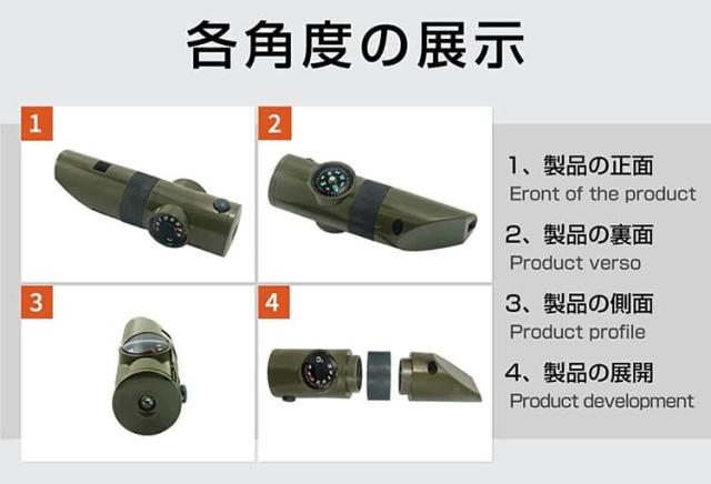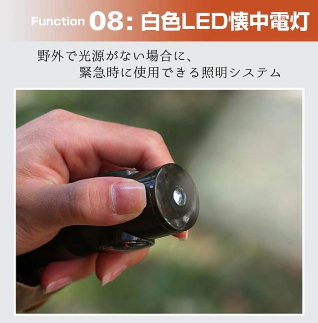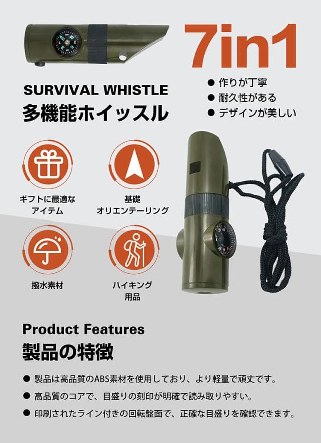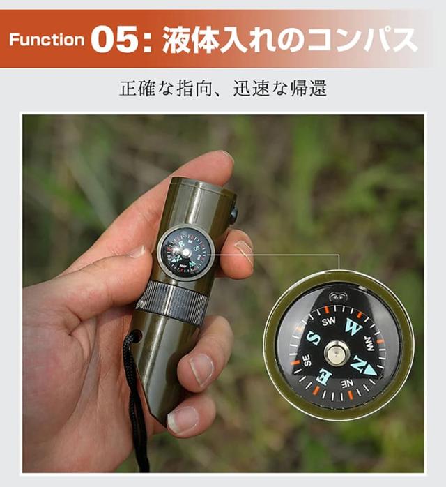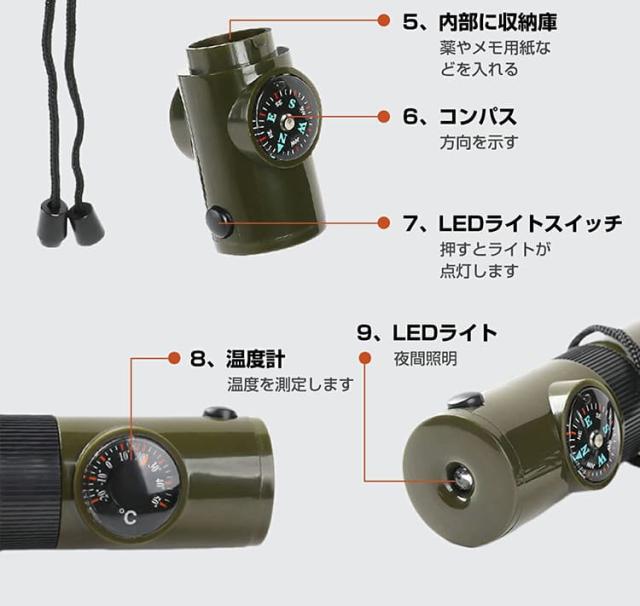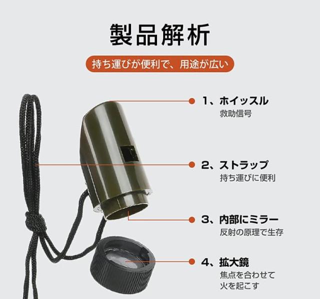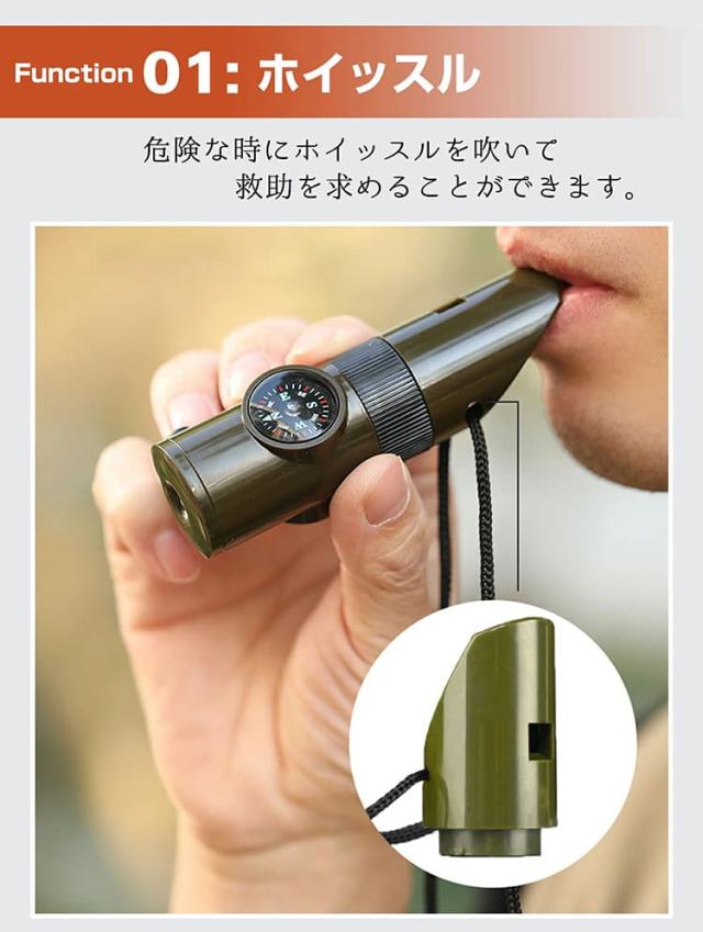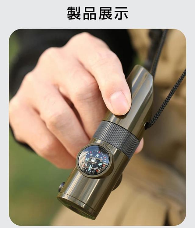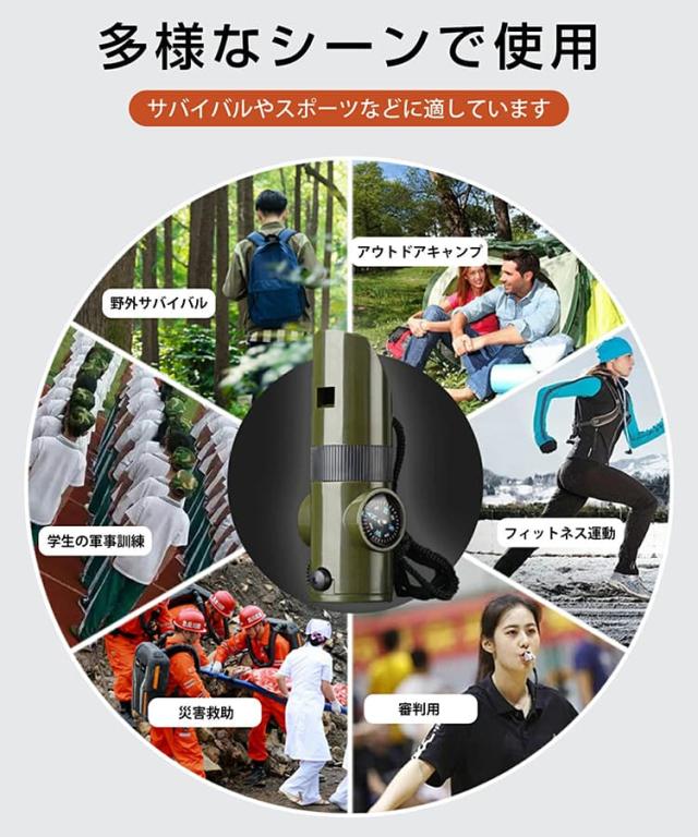 コンパスで方向を確認し、ホイッスルで救助を求め、懐中電灯で暗闇を照らすなど、野外での様々な状況に対応できます。