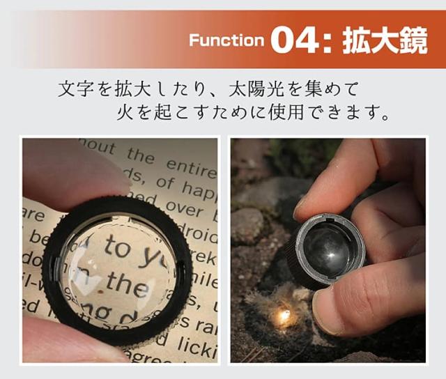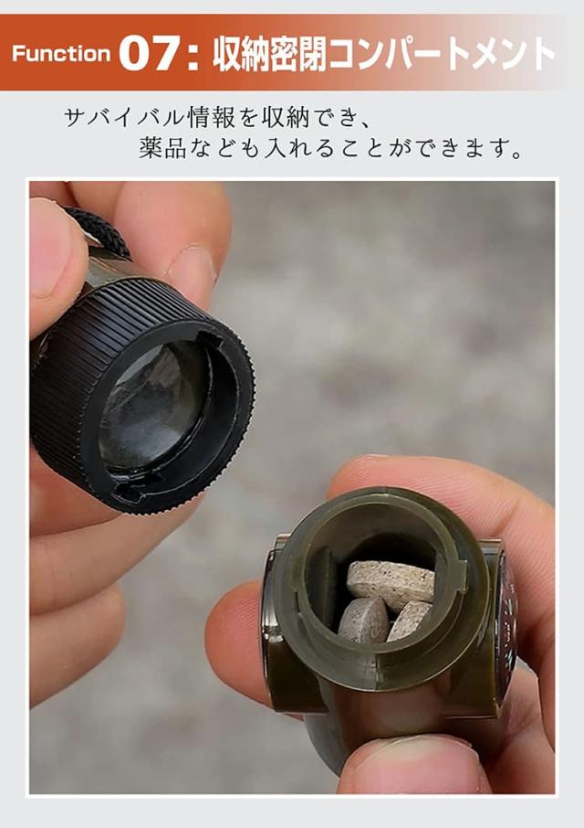 ホイッスル、拡大鏡、懐中電灯、コンパス、温度計、ルーペ、密閉容器の7つの機能を1つに統合。アウトドア活動に必要な様々なツールをコンパクトに集約しています。