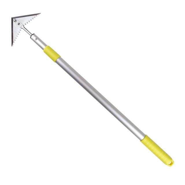 雑草抜きは、腰をかがめるので非常に辛い作業ですよね。本製品は、立ったまま作業ができるので、腰に負担が少なくてすみます。アルミ製のポールは非常に軽く、しかも好みの長さに無段階に伸縮できるので使いやすい長さにしてお使いいただけます。先端部分は三角形状で、草を刈るときに引っ掛かりがよくなるよう手前部分には特殊な山型刃の形状にしてます。アルミ製ポール部分は縮めると、車のトランクにも納まるほどの長さにできるので、共同菜園などに手軽に持ち込むこともできます。