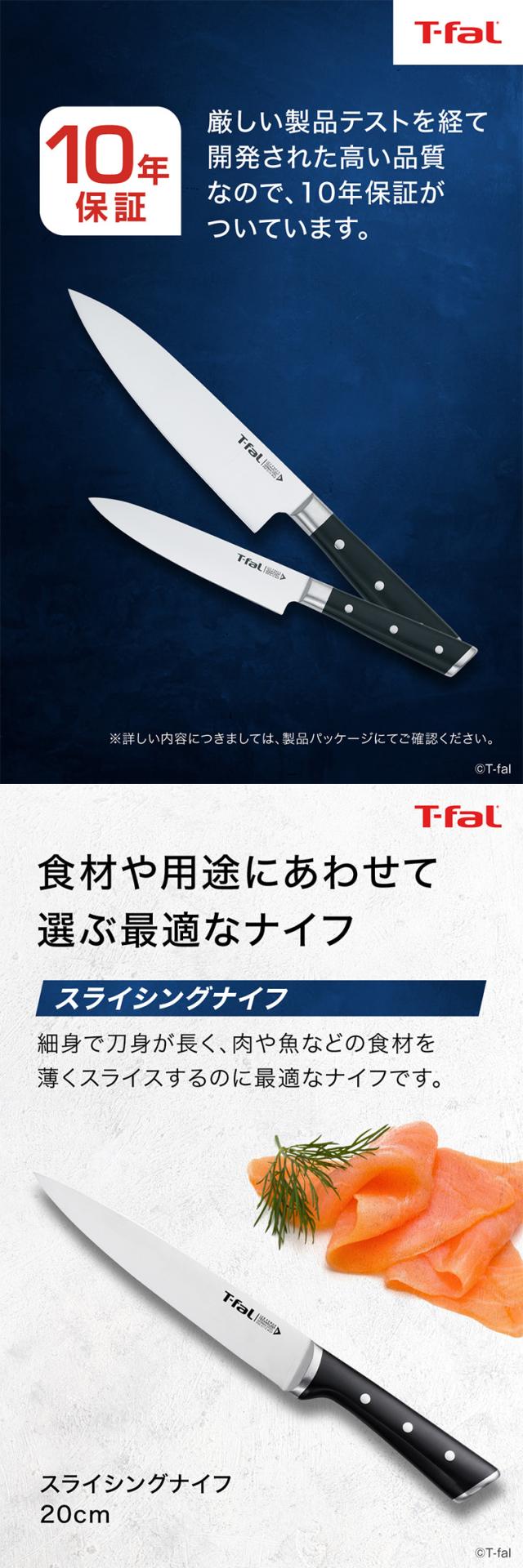 氷点下の急冷技術で、鋭い切れ味長続き。細身で刀身が長く、肉や魚などの食材を薄くスライスするのに適したスライシングナイフ。t-fal tfal 台所用品