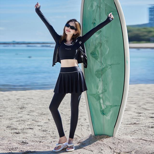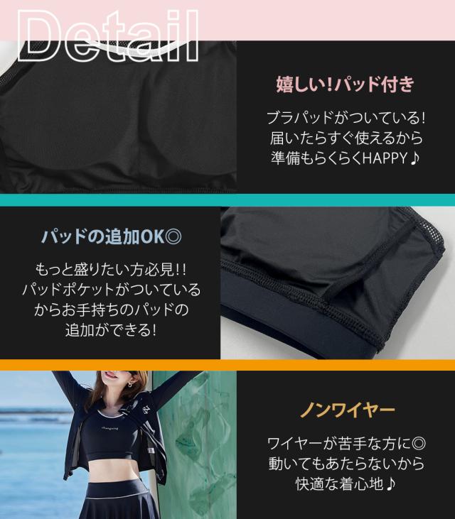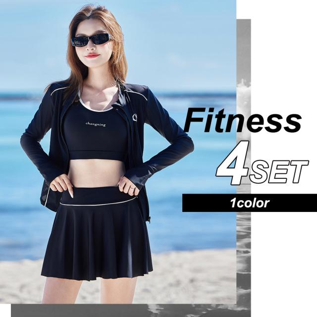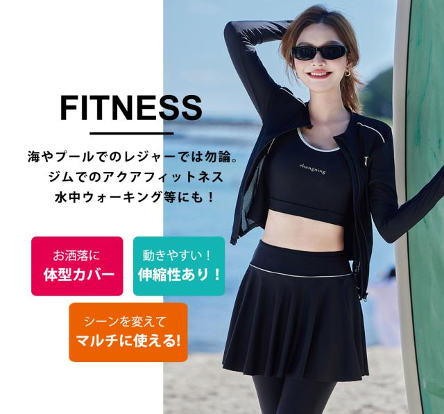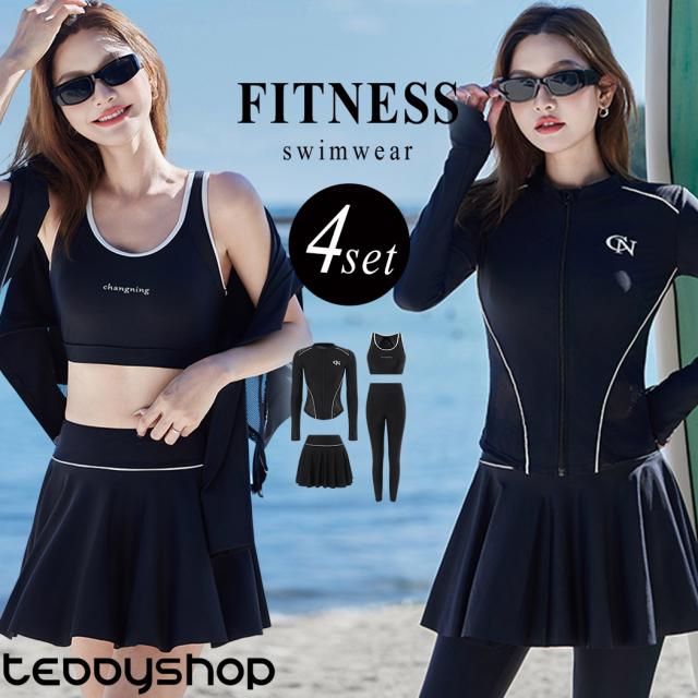 フィットネス 水着 レディース セパレート 大きいサイズ 体型カバー 長袖 4点セット ラッシュガード レギンス ブラ パンツ一体型スカート 4点セット メッシュ ジップ 紫外線対策 ノンワイヤー 二の腕 ウエスト ヒップ 太もも 脚 カバーアップ