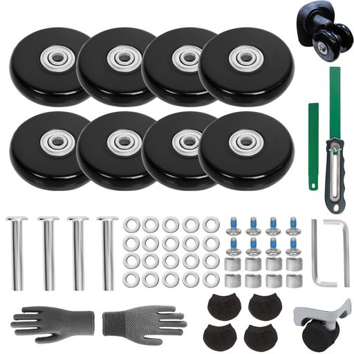 ?【スーツケースダブルキャスター交換キット54mm】車輪(54mm 8個)、 車軸(50mm 4本)、ワッシャー(12mm 20個)、 ネジ(12mm 8個)、車軸用アダプタリング(8mm 8個)、六角レンチ(2本)、車輪ソックス(4枚)、作業軍手(フーリサイズ 1ペア)、ノコギリ(1本)、 金切鋸刃(1枚)