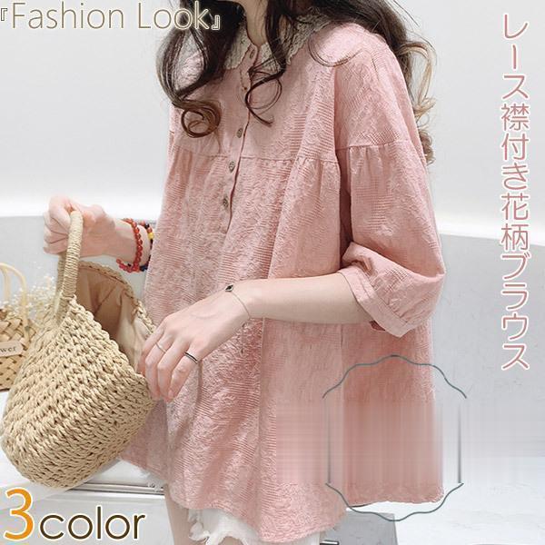 シャツブラウス 襟付き レディース 花柄ブラウス レース 大人 可愛い フロントボタン トップス フェミニン ゆったり 五分袖 春夏 新作 20代30代40代50代
