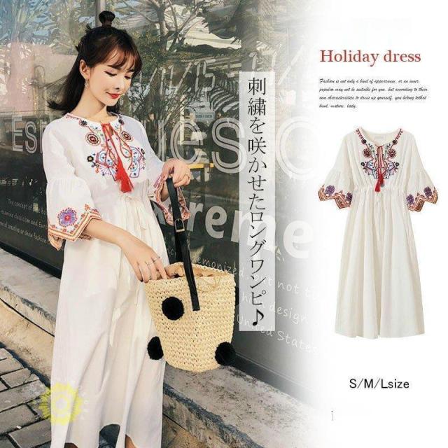 ワンピース ロング丈 刺繍ワンピース リゾートワンピース ボヘミアン レディース チュニック エスニック ウエストゴム リボン 七分袖 大きいサイズ 夏 20代