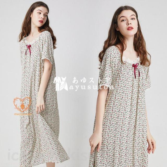 ネグリジェ パジャマ レディース 夏 ワンピース レディースルームウエア 半袖 花柄 ロング丈 綿パジャマ 部屋着 寝巻き ゆったり
